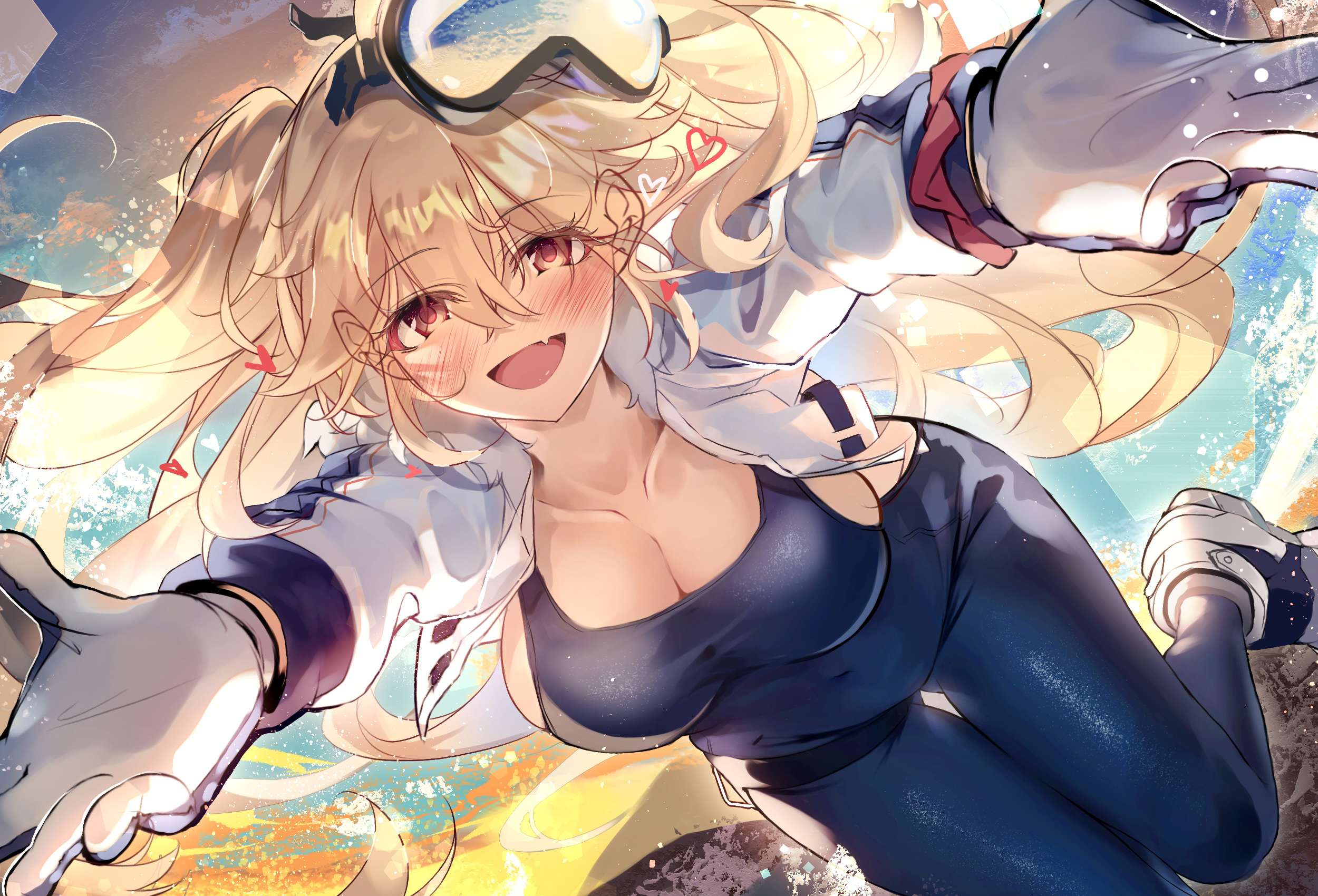 1girl ahoge azur_lane blonde_hair bluecher_(azur_lane) bluecher_(high-altitude_head_over_heels)_(azur_lane) blush breasts cleavage commentary fang full_body goggles heaven's_melody highres incoming_hug large_breasts long_hair looking_at_viewer mountain official_alternate_costume open_mouth outdoors red_eyes shrug_(clothing) sideboob ski_goggles smile snow solo sunset two_side_up white_shrug