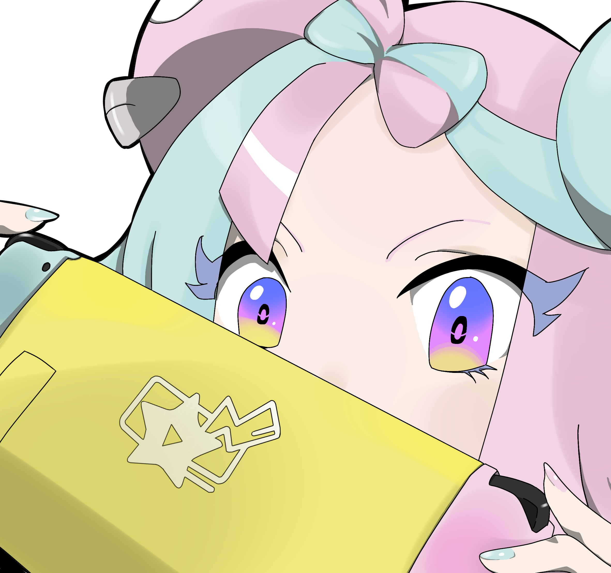 1girl blue_hair bow-shaped_hair character_hair_ornament gen_1_pokemon gradient_eyes hair_ornament handheld_game_console highres holding holding_handheld_game_console iono_(pokemon) kagenuma_karasu long_hair low-tied_long_hair magnemite multicolored_eyes multicolored_hair nintendo nintendo_switch pink_hair pokemon pokemon_scarlet_and_violet solo split-color_hair upper_body white_background