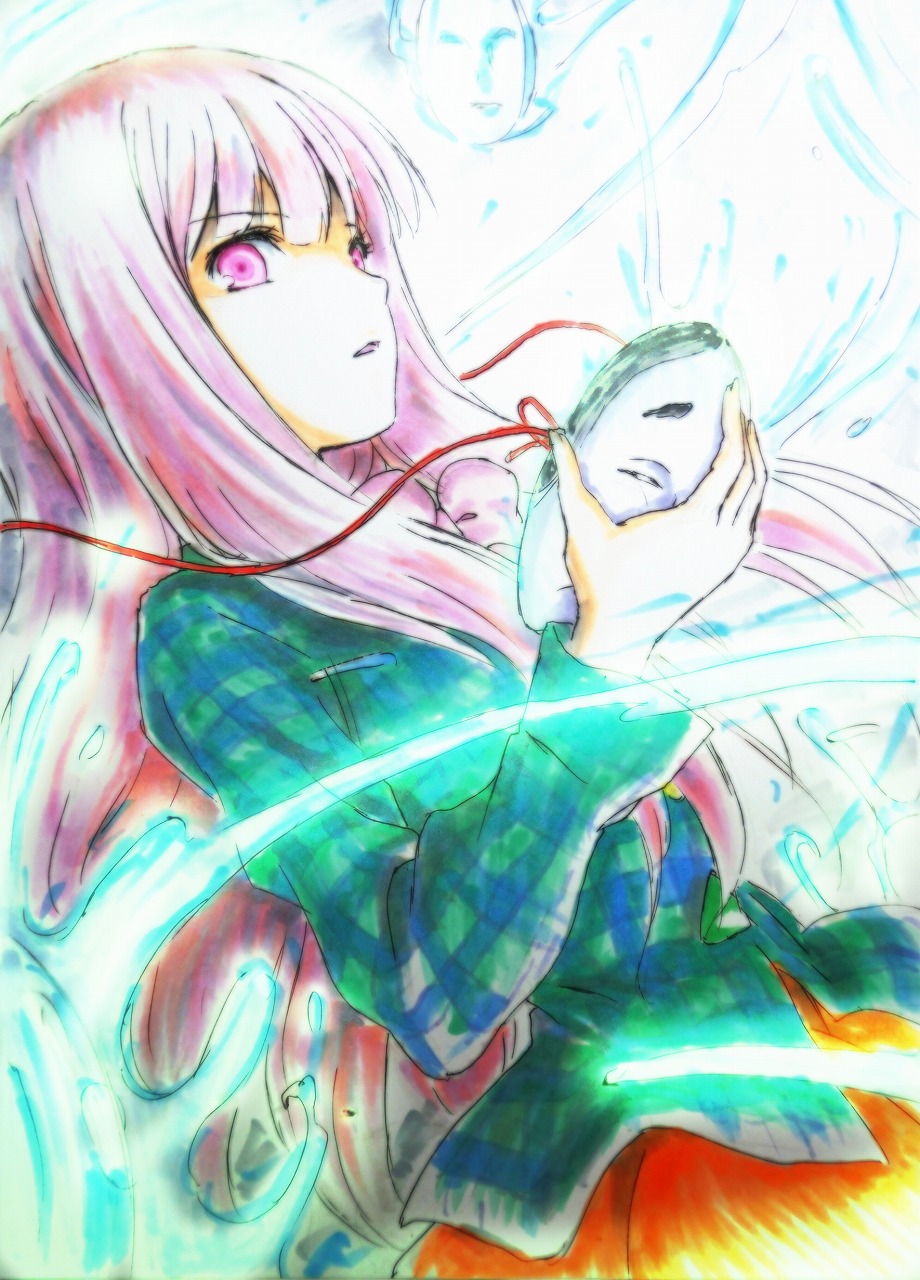 1girl beluo77 green_shirt hata_no_kokoro highres holding holding_mask long_hair looking_at_viewer marker_(medium) mask orange_skirt pink_eyes pink_hair shirt skirt solo touhou traditional_media