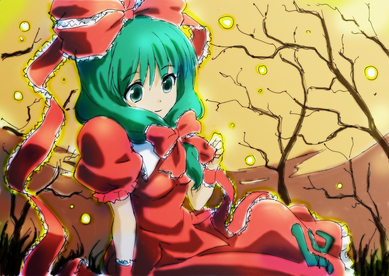 1girl beluo77 bow breasts dress frilled_dress frills front_ponytail green_eyes green_hair hair_bow hair_ribbon kagiyama_hina red_bow red_dress red_ribbon ribbon smile solo touhou