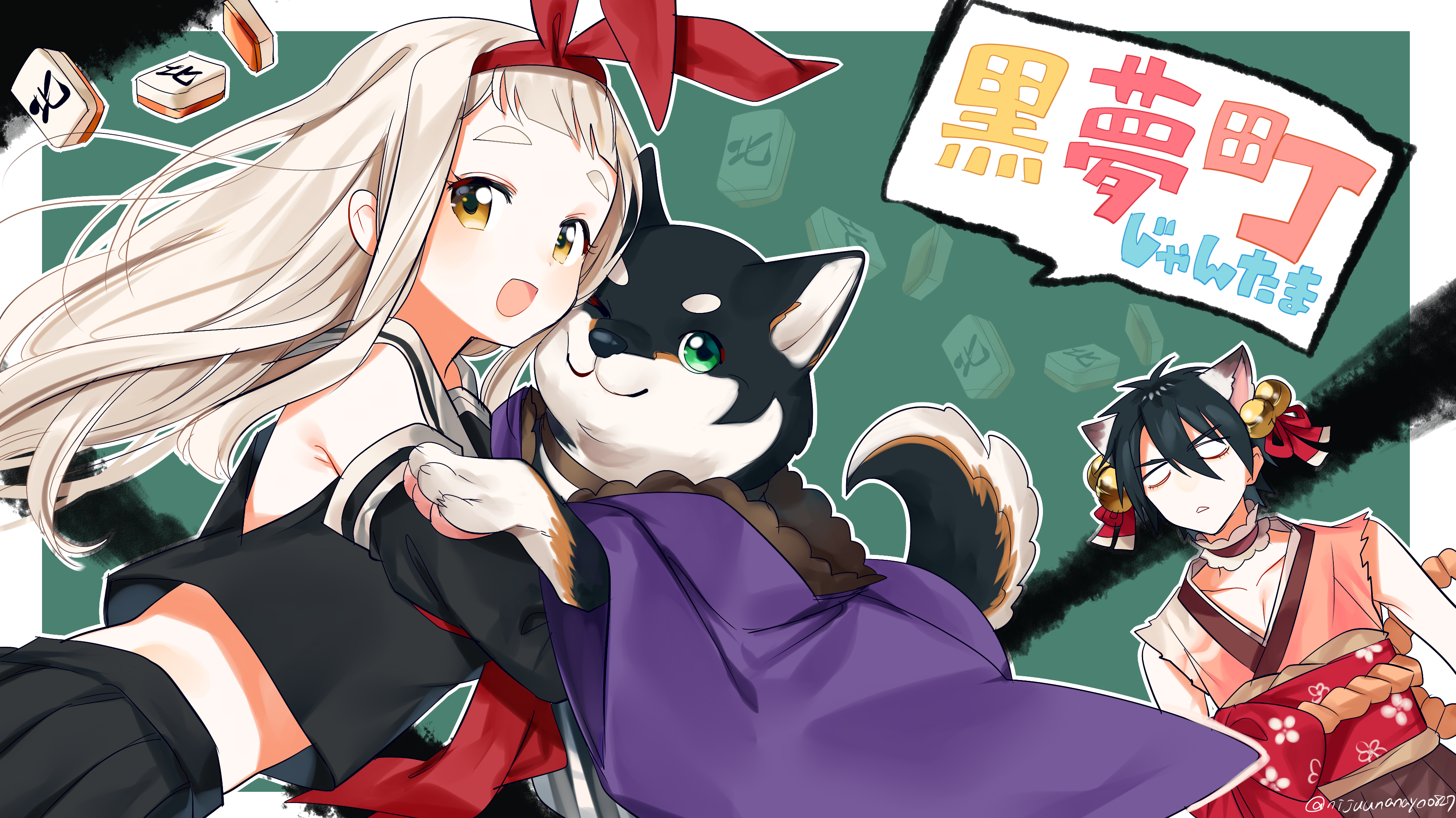1boy 1girl absurdres animal animal_ears bell black_hair black_serafuku black_shirt black_skirt black_sleeves blank_eyes border brown_eyes brown_hakama collarbone detached_sleeves dog green_background grey_hair hair_bell hair_between_eyes hair_ornament hairband hakama hakama_skirt highres japanese_clothes jingle_bell kemonomimi_mode kimono kokumucho_(nijisanji) kuroi_shiba long_hair long_sleeves machita_chima mahjong mahjong_tile midriff nijisanji ninahachi obi pink_kimono pleated_skirt puffy_long_sleeves puffy_sleeves red_hairband sailor_collar sash school_uniform serafuku shirt short_eyebrows skirt sleeveless sleeveless_kimono sleeveless_shirt thick_eyebrows translation_request twitter_username v-shaped_eyebrows very_long_hair virtual_youtuber white_border white_sailor_collar wide_sleeves yumeoi_kakeru