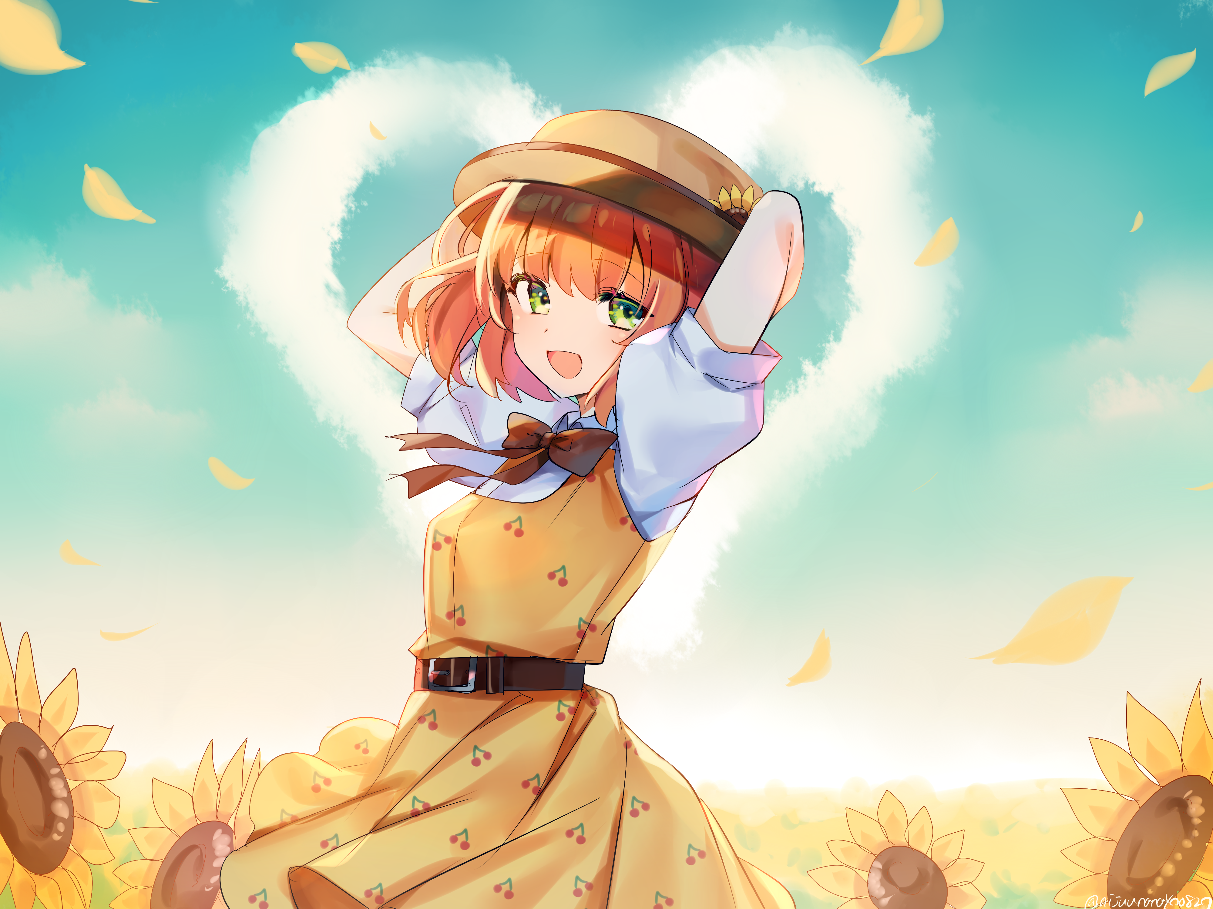 1girl :d absurdres arms_behind_head arms_up belt belt_buckle black_belt blue_sky bow breasts brown_hat buckle cherry_print cloud collared_shirt day dress field flower flower_field food_print fruit_print green_eyes hat hat_flower heart highres honma_himawari honma_himawari_(6th_costume) looking_at_viewer nijisanji ninahachi open_mouth orange_hair outdoors petals print_dress puffy_short_sleeves puffy_sleeves red_bow shirt short_sleeves sky sleeveless sleeveless_dress small_breasts smile solo sunflower sunflower_field twitter_username virtual_youtuber white_shirt yellow_dress yellow_flower