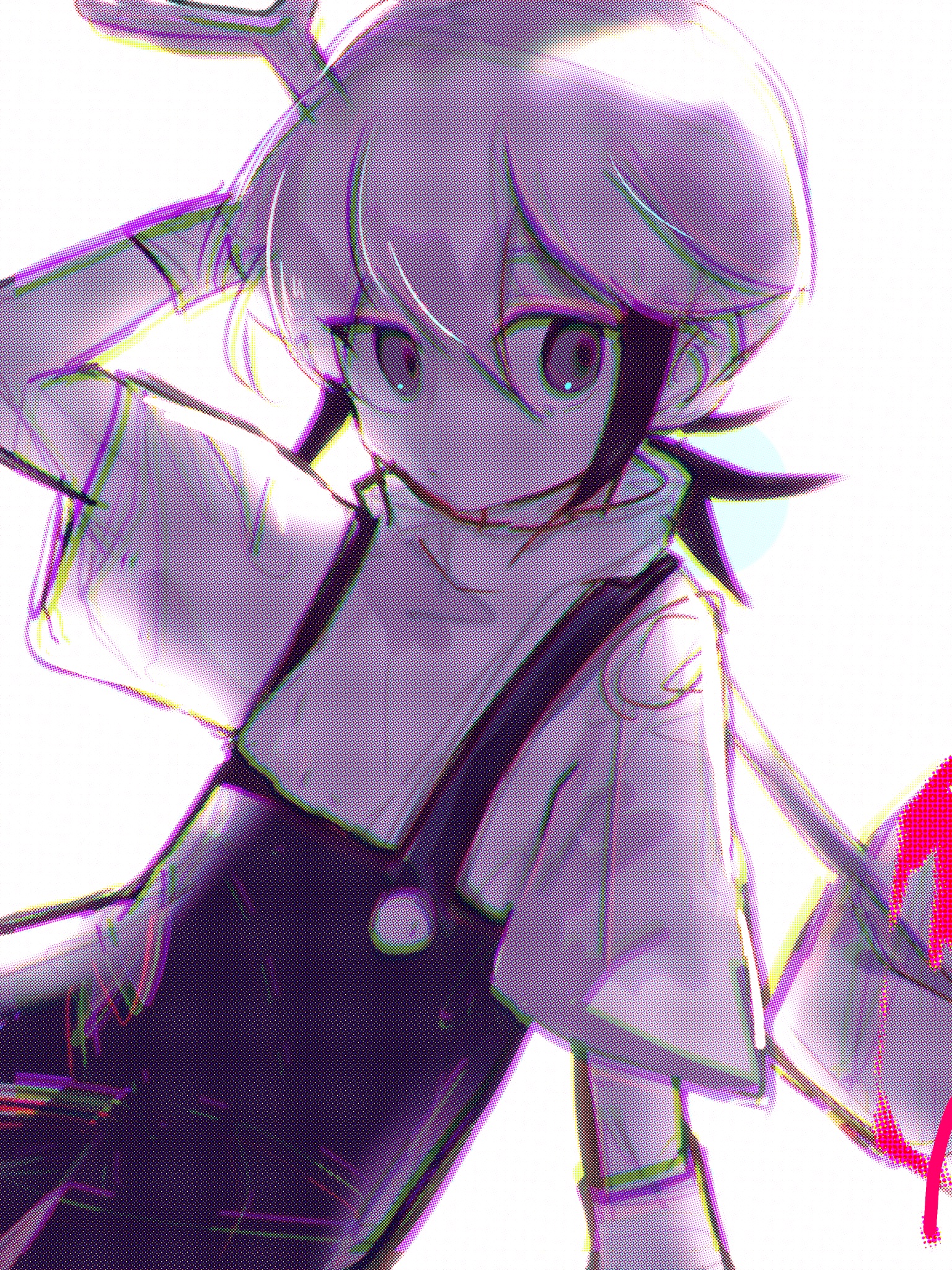 1other ambiguous_gender black_eyes black_overalls blood blood_on_shovel colored_inner_hair fastening_(zutomayo) gloves highres holding holding_shovel looking_at_viewer multicolored_hair overalls pino_(pino_ztmy) shirt shovel sidelocks teiketsu_(fastening)_(zutomayo) teiketsu_(zutomayo) turtleneck turtleneck_shirt white_gloves white_hair white_shirt zutto_mayonaka_de_ii_no_ni