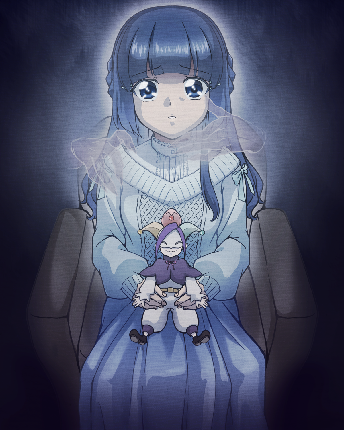1girl aoki_reika blouse blue_eyes blue_hair blue_skirt blue_sweater couch doll ghost hair_ornament hairclip highres holding holding_doll izumo_kaoru joker_(precure) long_hair long_sleeves open_mouth precure shirt sitting skirt smile_precure! sweater white_shirt