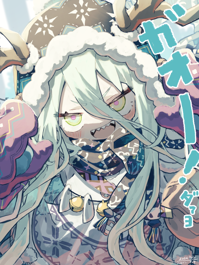 1girl antlers beanie blue_hat blue_scarf blush breasts fate/grand_order fate_(series) green_eyes hair_between_eyes haronin_fukke hat horns long_hair long_sleeves looking_at_viewer louhi_(fate) louhi_(second_ascension)_(fate) mittens open_mouth purple_mittens scarf sharp_teeth small_breasts smile solo sweater teeth translation_request white_hair white_sweater