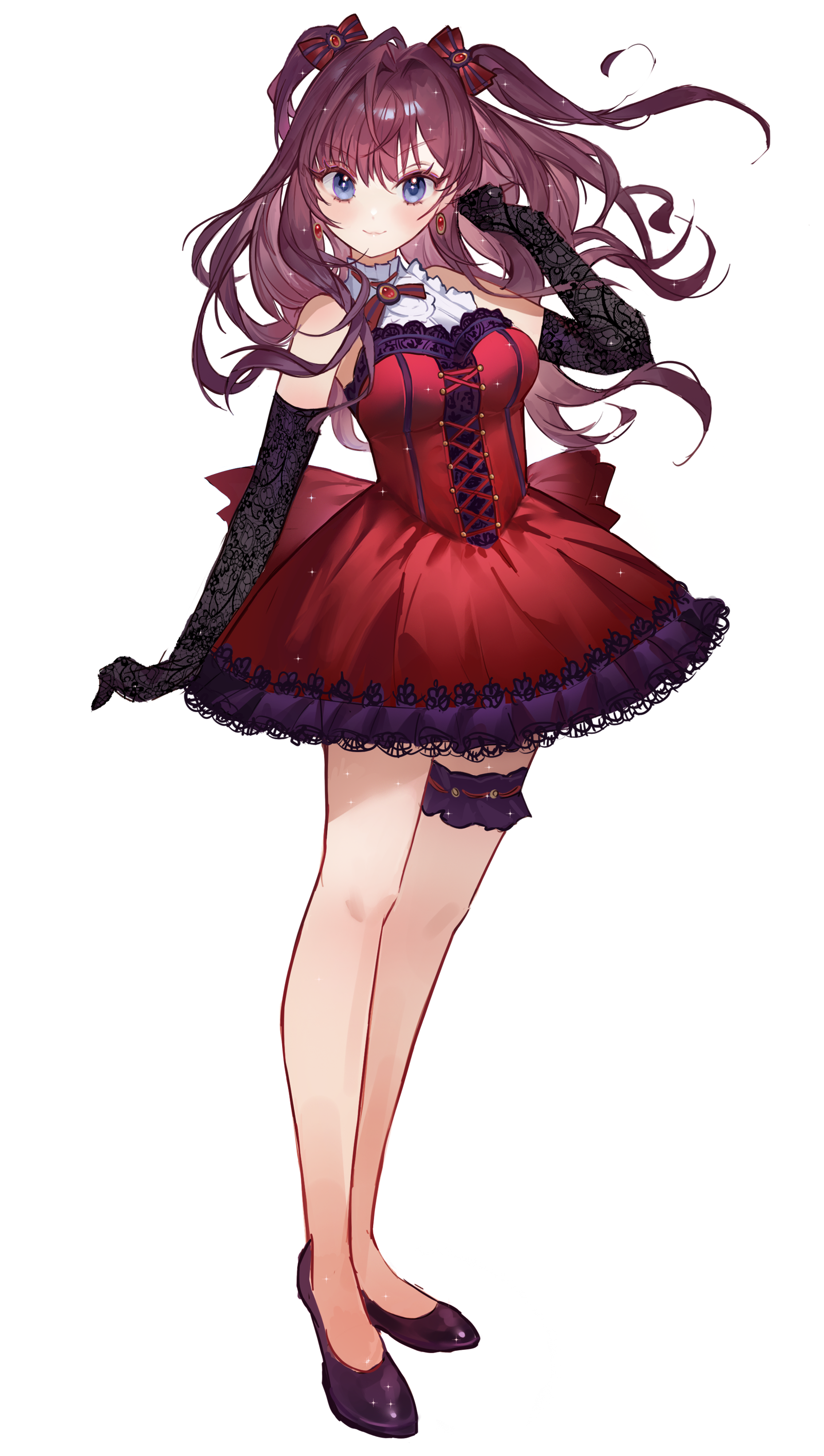 1girl absurdres b2w black_gloves blue_eyes blush breasts brown_hair commentary_request cross-laced_clothes dress elbow_gloves floating_hair frilled_thigh_strap full_body gloves highres ichinose_shiki idolmaster idolmaster_cinderella_girls lace lace-trimmed_dress lace_gloves lace_trim long_hair looking_at_viewer medium_breasts partial_commentary purple_footwear red_dress smile solo thigh_strap two_side_up very_long_hair