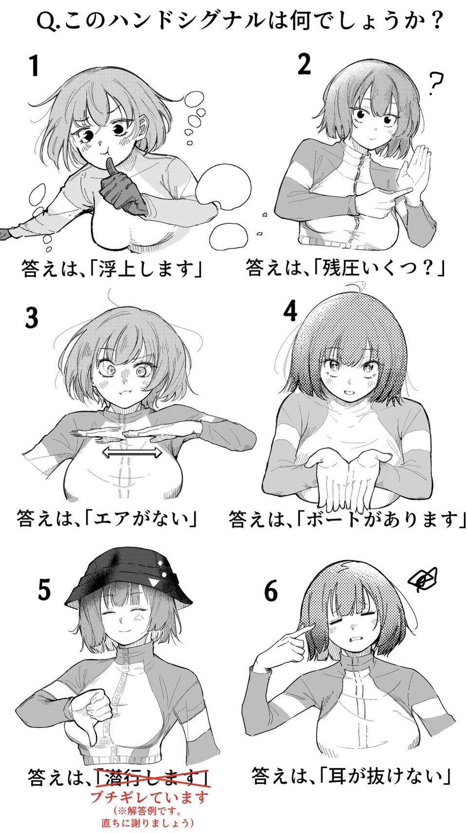 1girl ? anger_vein blue_archive blush breasts bucket_hat floating_hair gloves greyscale hat highres loose_hair_strand mecchainukaitai monochrome pointing pointing_at_self saki_(blue_archive) saki_(swimsuit)_(blue_archive) thumbs_down thumbs_up