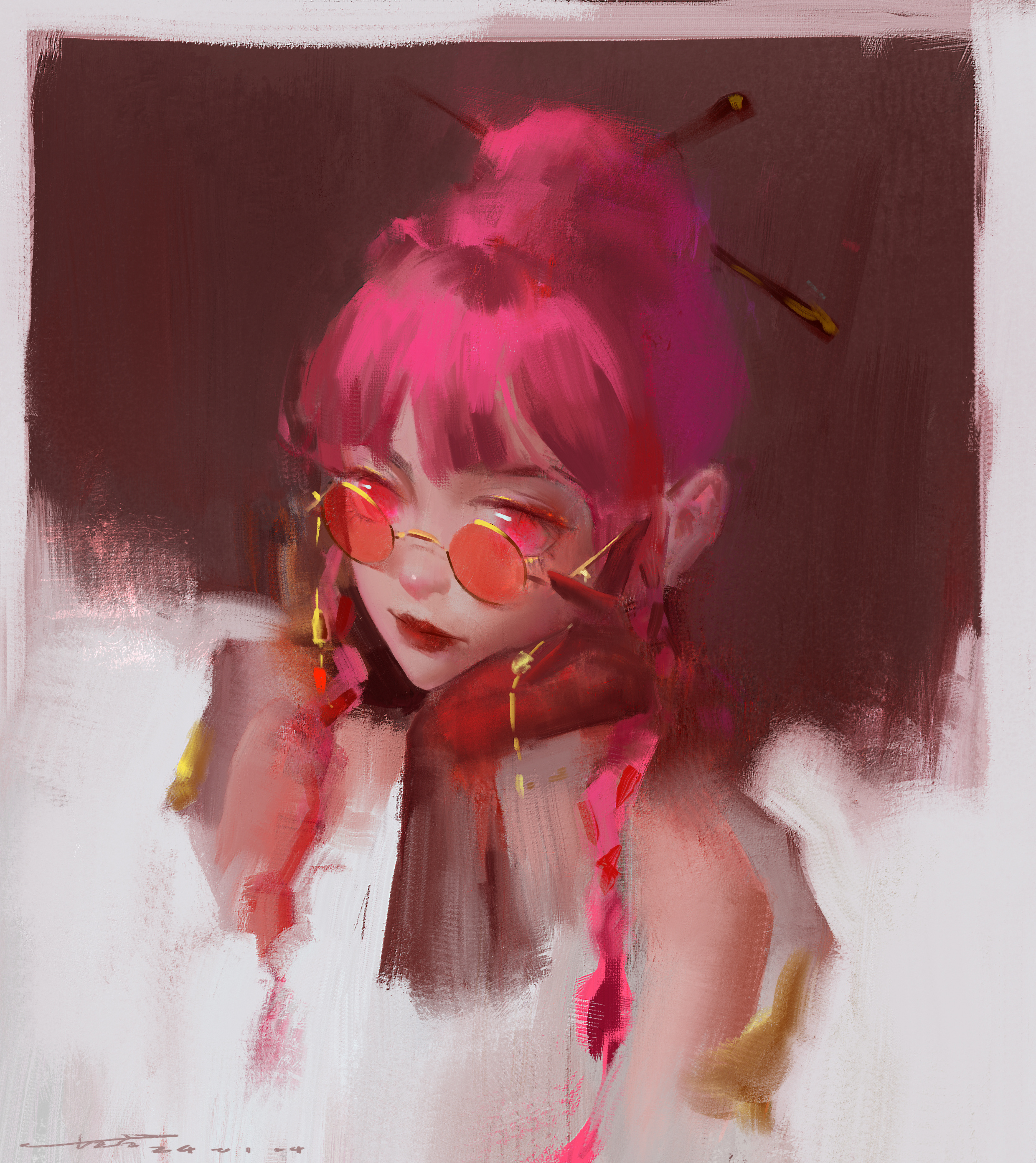 1girl absurdres bare_shoulders black_background black_gloves blunt_bangs border chinese_commentary closed_mouth commentary_request cropped_torso expressionless eyelashes eyeliner frilled_shirt frills gloves hair_bun hair_ornament hairpin hand_on_own_cheek hand_on_own_face highres lipstick makeup nikki_(nikki) nikki_(series) pink_eyes pink_hair red-tinted_eyewear red_eyeliner red_lips round_eyewear shi_sebai_haoyun_lailailai shining_nikki shirt short_hair signature single_hair_bun sleeveless sleeveless_shirt solo sunglasses tinted_eyewear two-tone_background updo white_background white_border white_shirt yellow-framed_eyewear