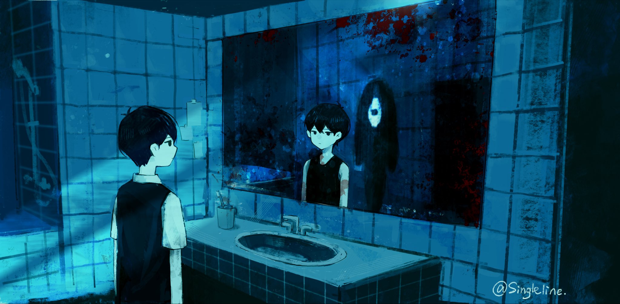 2boys antenna_hair arms_at_sides bare_shoulders black_eyes black_hair black_sweater_vest black_tank_top blood blood_on_mirror blue_theme chinese_commentary closed_mouth colored_skin commentary_request cup different_reflection double-parted_bangs dual_persona hair_between_eyes highres indoors jitome looking_at_mirror mirror multiple_boys no_pupils omori omori_(omori) reflection shirt short_hair sink something_(omori) ssingleline sunny_(omori) sweater_vest tank_top tile_wall tiles toothbrush upper_body white_shirt white_skin