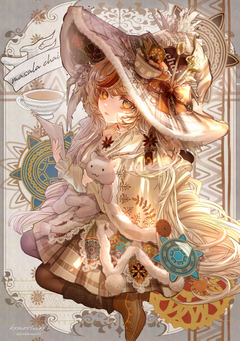 boots brown_eyes brown_hair cup fashion flower frilled_headwear hat hat_flower komorihikki lace-trimmed_headwear lace_trim layered_clothes layered_skirt leg_warmers lolita_fashion original ornate skirt stuffed_toy tagme tea teacup winter winter_clothes witch witch_hat