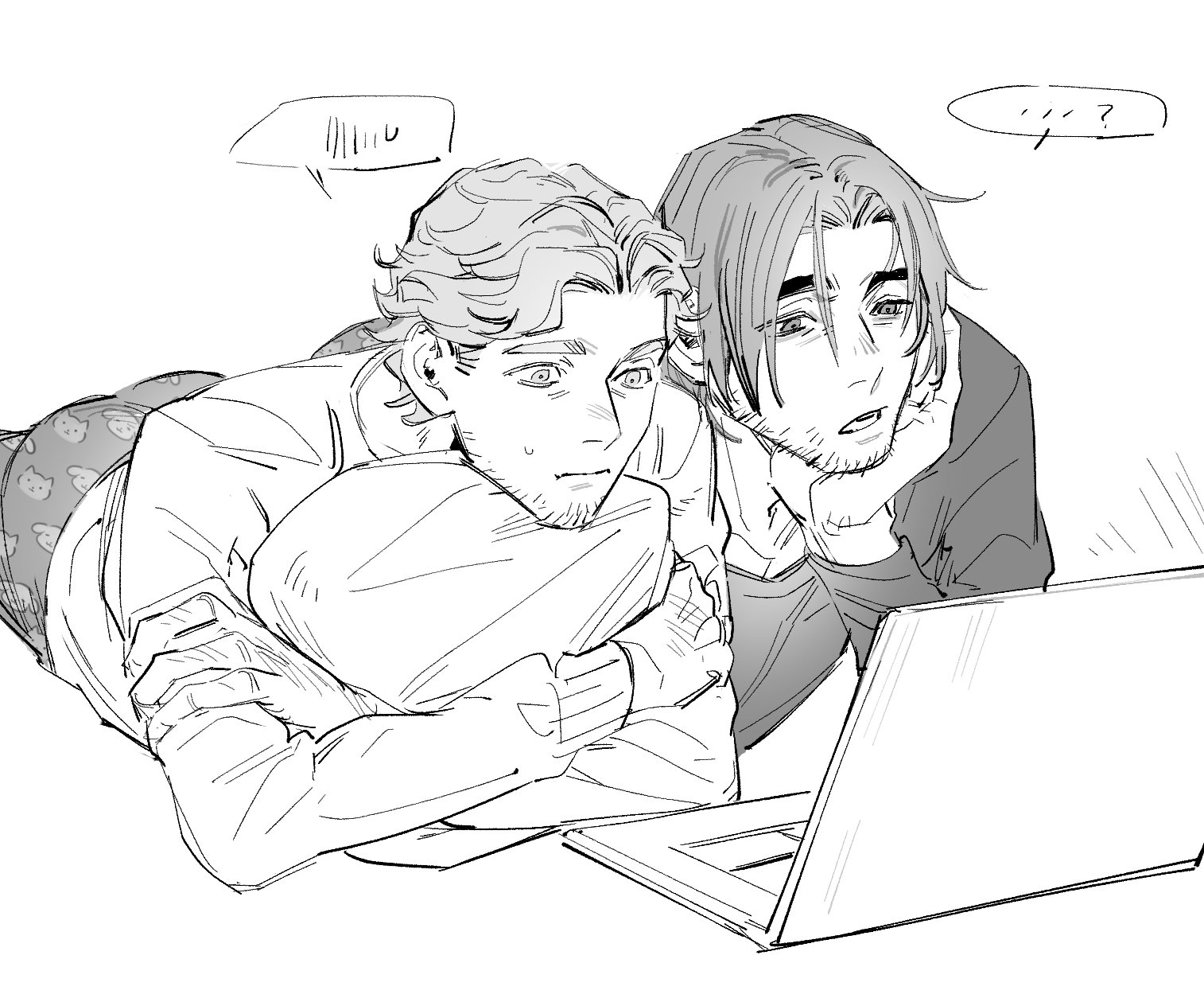 ... 2boys aesjmhi5 animal_print cat_print closed_mouth computer curly_(mouthwashing) curly_(pre-crash)_(mouthwashing) facial_hair greyscale hand_on_own_face hand_up highres hugging_object jimmy_(mouthwashing) long_sleeves looking_at_object lying male_focus monochrome mouthwashing multiple_boys on_stomach open_mouth pants pillow pillow_hug puffy_long_sleeves puffy_sleeves rabbit_print shirt short_hair simple_background spoken_blush spoken_ellipsis sweatdrop sweater teeth