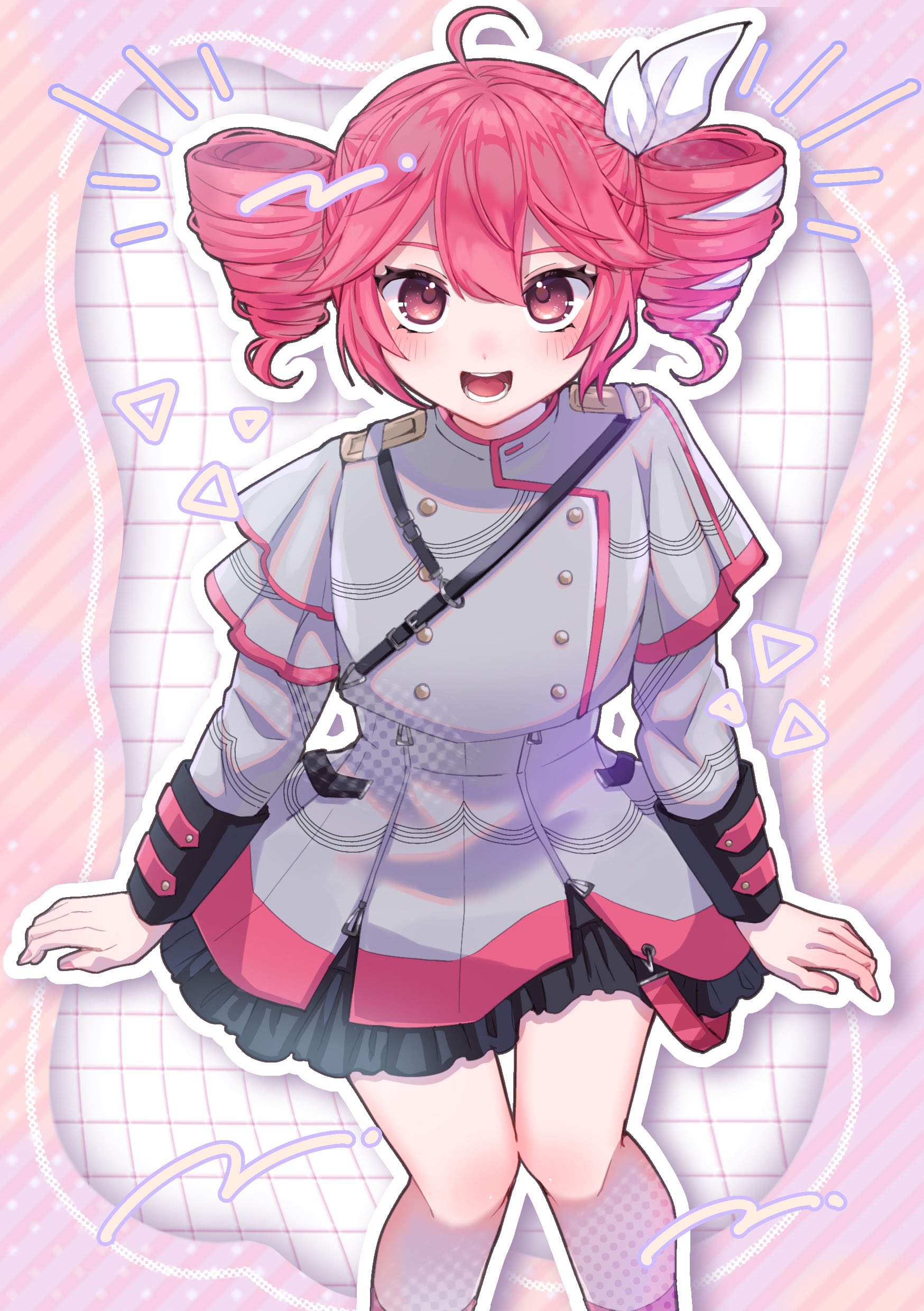 1girl absurdres ahoge arms_at_sides belt black_belt black_skirt blush bow buttons double-breasted double-parted_bangs drill_hair feet_out_of_frame fingernails flat_chest grey_jacket grey_skirt hair_between_eyes hair_bow hair_ribbon highres invisible_chair jacket kasane_teto kasane_teto_(sv) kobayashi_ruten layered_sleeves long_sleeves looking_at_viewer nail_polish open_mouth pink_background red_belt red_eyes red_hair red_nails red_skirt red_trim ribbon shoulder_belt shoulder_boards simple_background sitting skirt sleeve_cuffs solo straight-on striped_clothes striped_jacket striped_skirt synthesizer_v teeth tongue twin_drills utau white_bow white_ribbon