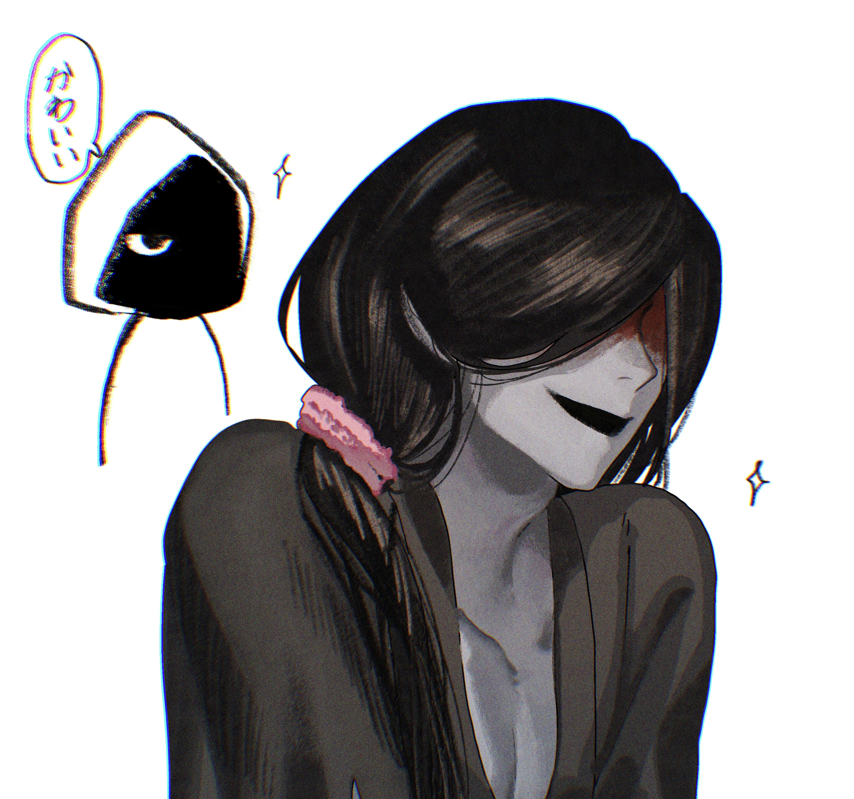 1boy 1girl absurdres black_hair black_kimono blood blood_on_face commentary_request hair_ornament hair_over_shoulder hair_scrunchie adashino_adami highres homicipher japanese_clothes kimono long_hair mr._crawling rabetan scrunchie simple_background sparkle sparkling_aura translation_request white_background