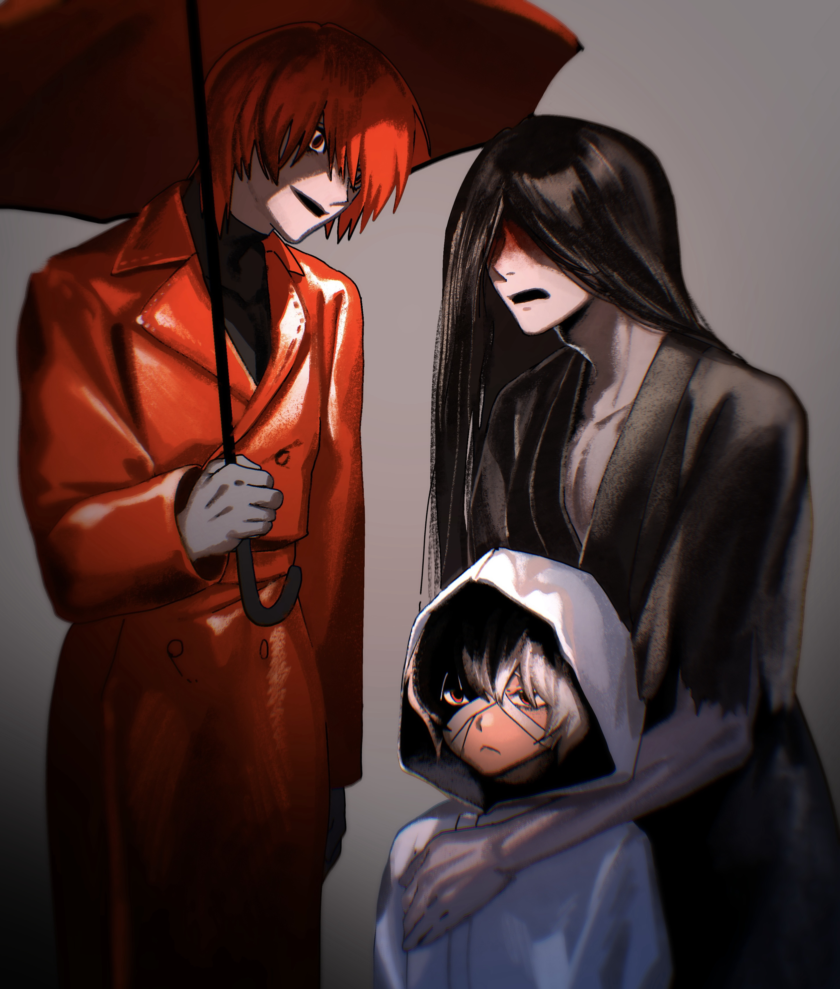 1girl 2boys absurdres black_hair black_kimono blood blood_on_face coat commentary_request cowboy_shot grey_background adashino_adami highres holding holding_umbrella homicipher japanese_clothes kimono long_hair looking_at_another looking_at_viewer mr._crawling mr._scarletella multiple_boys rabetan raincoat red_coat red_eyes red_hair red_umbrella short_hair simple_background umbrella white_raincoat