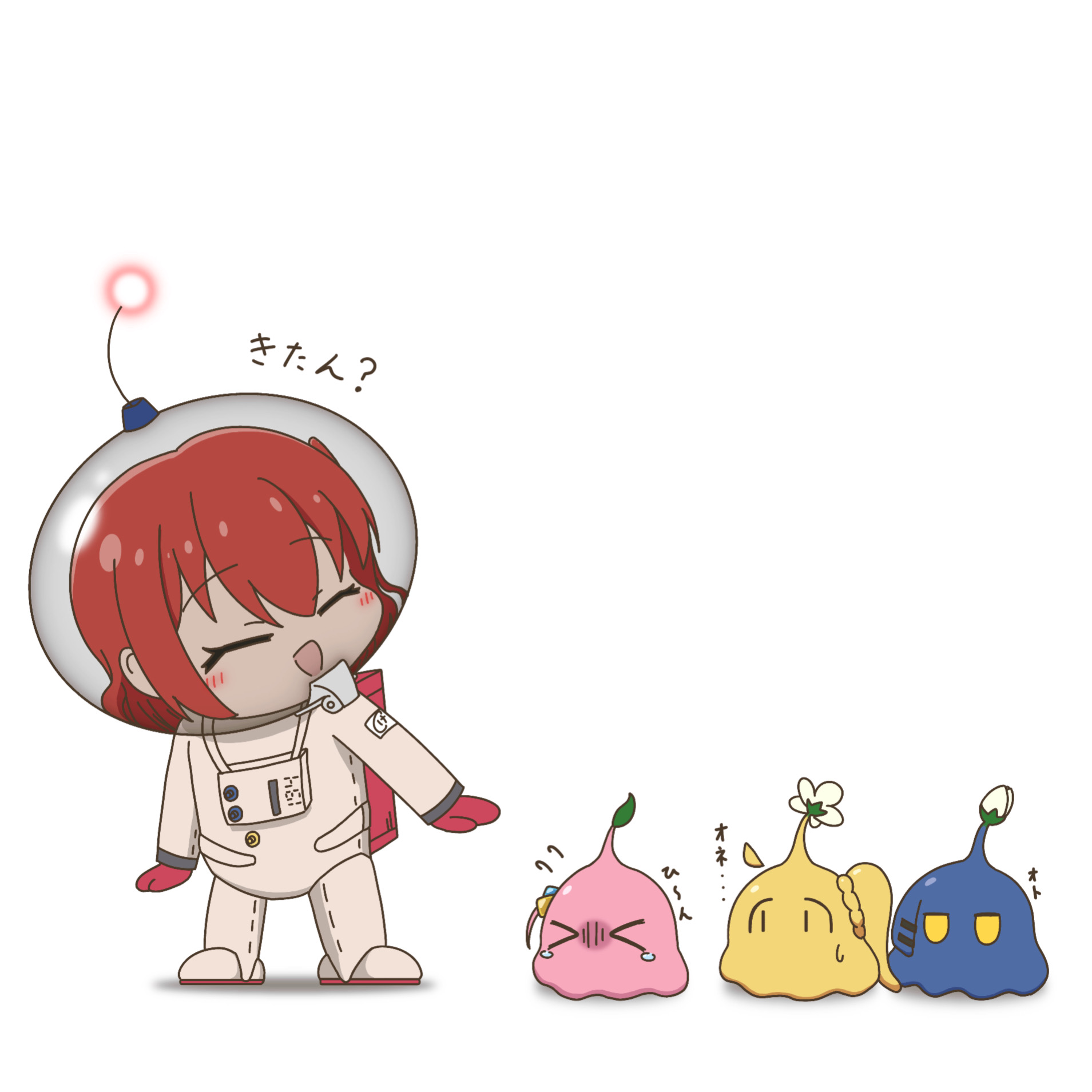 bocchi_the_rock! cosplay full_body gotoh_hitori gotoh_hitori_(octopus) highres ijichi_nijika kita_ikuyo long_hair long_sleeves multiple_girls nintendo olimar olimar_(cosplay) open_mouth parody pikmin_(series) red_hair sanpai_(sanpairakugaki) simple_background translation_request white_background yamada_ryo