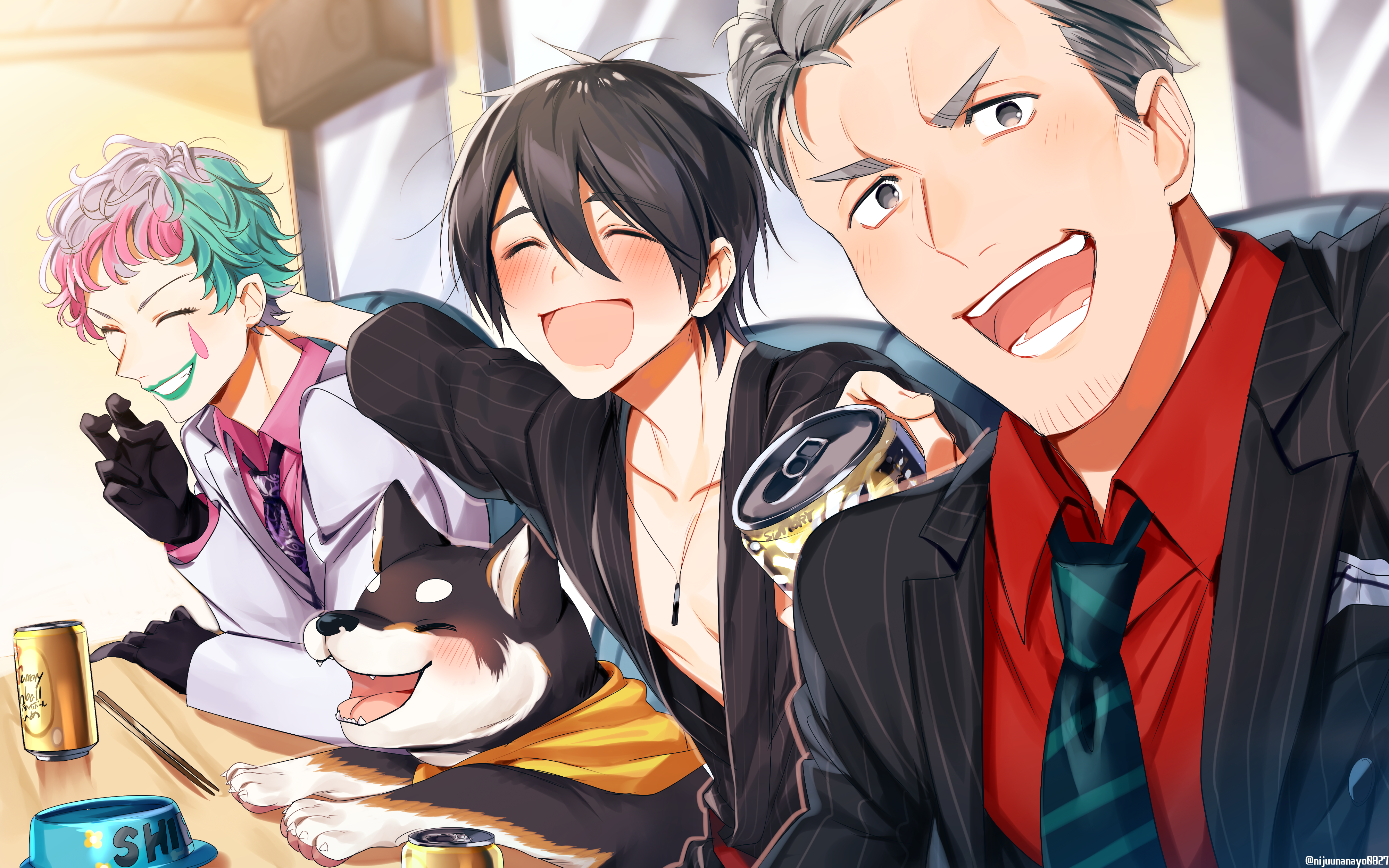 3boys :d ^_^ absurdres animal beer_can black_gloves black_hair black_jacket black_kimono blue_necktie blurry blurry_background blush bowl brown_eyes can chopsticks closed_eyes collared_shirt depth_of_field diagonal-striped_clothes diagonal-striped_necktie dog drink_can drunk formal_clothes gloves green_hair green_lips grey_hair grey_jacket grin highres holding holding_can indoors jacket japanese_clothes joe_rikiichi joe_rikiichi_(1st_costume) kimono kuroi_shiba maimoto_keisuke maimoto_keisuke_(2nd_costume) male_focus multicolored_hair multiple_boys necktie nijisanji ninahachi open_clothes open_jacket open_mouth pet_bowl pink_hair pink_shirt pinstripe_jacket pinstripe_pattern purple_necktie red_shirt shirt smile striped_clothes suit thick_eyebrows two-tone_hair v-shaped_eyebrows virtual_youtuber yumeoi_kakeru