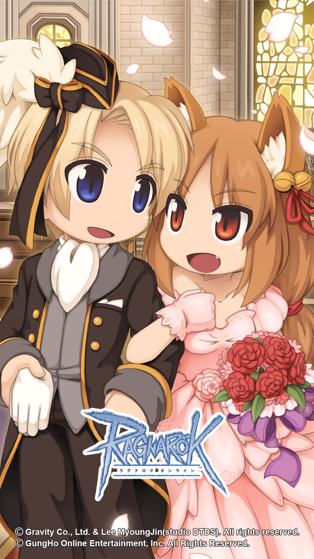 1boy 1girl animal_ear_fluff animal_ears ascot bell bicorne black_coat black_hat black_pants blonde_hair blue_eyes bouquet breasts bride brown_eyes brown_hair buttons church coat copyright_notice cowboy_shot dress fang flower fox_ears fox_girl gloves gold_trim grey_shirt groom hair_bell hair_ornament hair_ribbon hat hetero highres holding holding_bouquet husband_and_wife indoors jingle_bell locked_arms logo long_hair looking_at_another looking_to_the_side official_art official_wallpaper open_mouth pants petals pew pink_dress pink_gloves ragnarok_online red_flower red_ribbon red_rose ribbon rose shirt short_hair small_breasts smile stained_glass strapless strapless_dress unworn_gloves wedding wedding_dress white_ascot white_gloves yuichirou