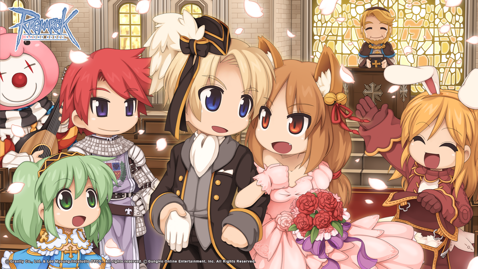 3girls 4boys animal_ear_fluff animal_ears arch_bishop_(ragnarok_online) armor ascot beard bell belt bicorne black_coat black_hat black_pants black_scarf blonde_hair blue_dress blue_eyes bouquet breasts bride brown_belt brown_eyes brown_gloves brown_hair brown_jacket buttons chainmail church coat copyright_notice cowboy_shot dress emblem facial_hair fake_animal_ears fang father_vomars flower fox_ears fox_girl frilled_dress frilled_sleeves frills gauntlets gloves gold_trim green_eyes green_hair grey_shirt groom hair_bell hair_ornament hair_ribbon hat hetero highres holding holding_bouquet holding_instrument husband_and_wife indoors instrument jacket jingle_bell knight knight_(ragnarok_online) locked_arms logo long_hair looking_at_another looking_to_the_side lute_(instrument) masked merchant_(ragnarok_online) minstrel_(ragnarok_online) multiple_boys multiple_girls official_alternate_costume official_art official_wallpaper open_mouth pants pauldrons petals pew pink_dress pink_gloves poring priest purple_eyes purple_tabard rabbit_ears ragnarok_online red_flower red_hair red_nose red_ribbon red_rose ribbon rose scarf shirt short_hair shoulder_armor sidelocks small_breasts smile stained_glass strapless strapless_dress striped_clothes striped_scarf tabard twintails two-tone_dress unworn_gloves wedding wedding_dress white_ascot white_dress white_gloves white_scarf white_shirt yuichirou