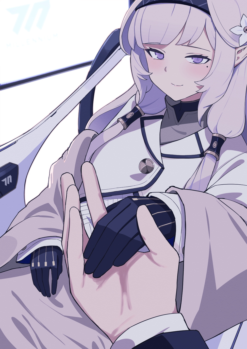 1girl black_gloves blue_archive flower gloves hair_flower hair_ornament hair_tubes hairband highres himari_(blue_archive) holding_hands mole mole_under_eye odaneru_apart pointy_ears pov pov_hands purple_eyes smile striped_clothes striped_hairband wheelchair white_flower