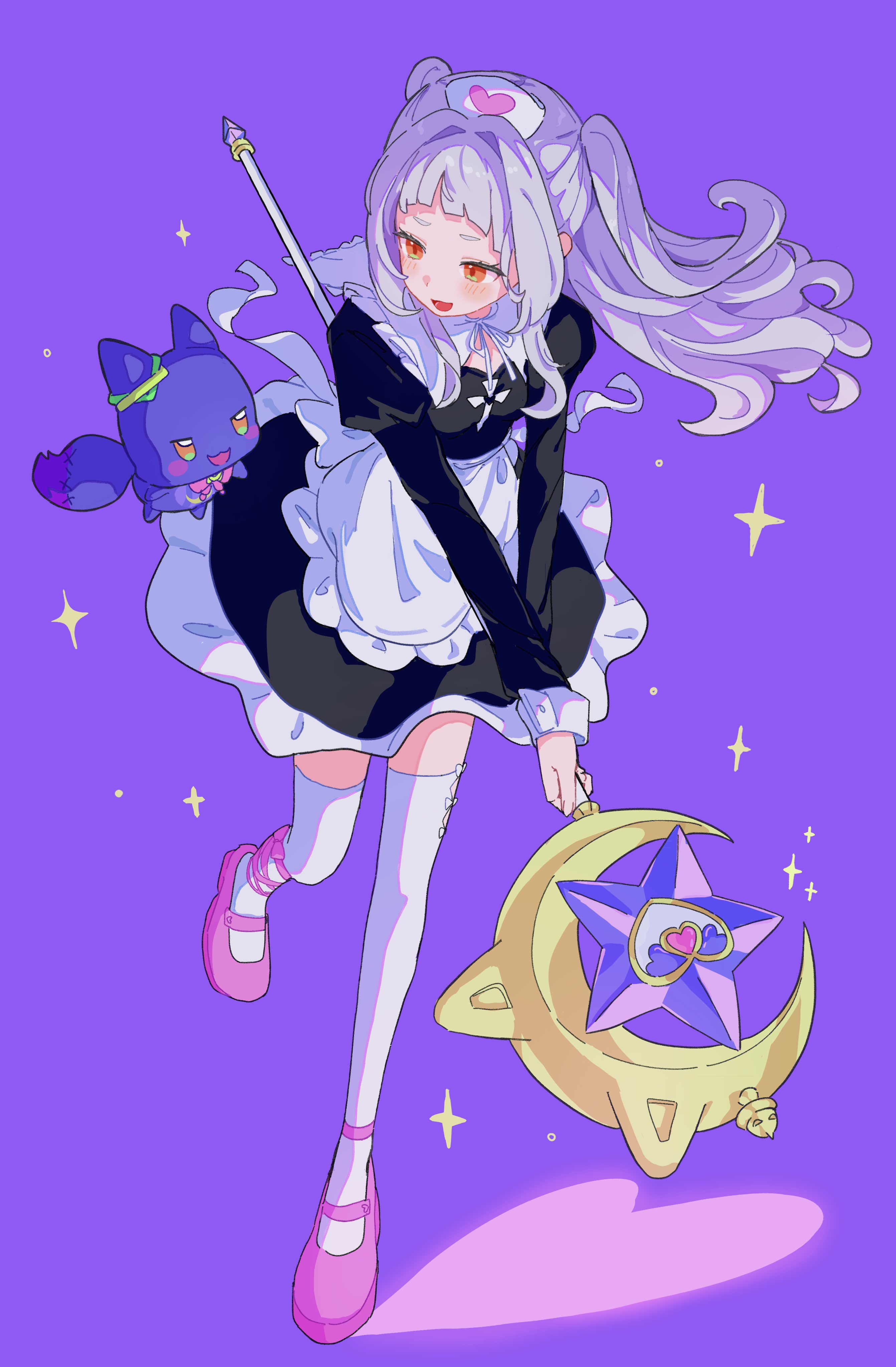 1girl absurdres alternate_costume ankle_ribbon apron black_dress blunt_bangs blush bow bowtie capelet commentary crescent_wand dress floating_hair frilled_capelet frilled_dress frilled_skirt frills full_body glowing grey_hair hair_intakes hashtag-only_commentary hat highres holding holding_wand hololive juliet_sleeves layered_skirt leg_ribbon leg_up long_hair long_sleeves mage_staff magical_girl maid maid_apron mary_janes mei_am0 murasaki_shion nurse_cap open_mouth orange_eyes pink_shoes puffy_sleeves purple_background ribbon shiokko_(murasaki_shion) shoes short_dress short_eyebrows sidelocks skirt skirt_set sleeve_cuffs solo sparkle staff star_wand untranslatable_commentary talking thighhighs twintails virtual_youtuber waist_apron wand white_apron white_bow white_bowtie white_capelet white_thighhighs