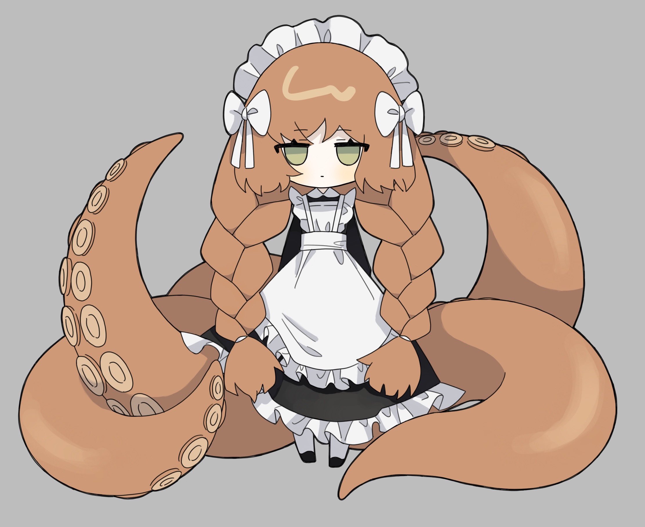 1girl apron black_dress braid dress frilled_apron frills full_body green_eyes grey_background highres ishmael_(project_moon) jitome kitaku_(ienikaeru) limbus_company looking_at_viewer low_twin_braids maid maid_apron maid_headdress project_moon simple_background solo tentacles tentacles_under_clothes twin_braids