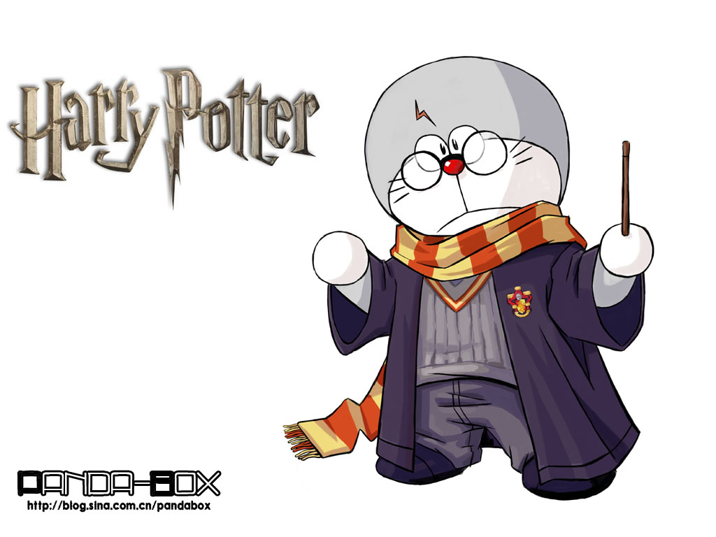 1boy black_pants closed_mouth coat copyright_name doraemon doraemon_(character) english_text full_body glasses grey_shirt harry_potter_(series) holding long_sleeves looking_at_viewer pandabox pants scarf shirt simple_background solo standing white_background winter_clothes wizarding_world