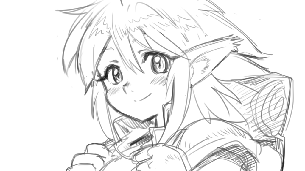1girl blush closed_mouth fam_(ruin_explorers) greyscale hikyou_tanken_fam_&_ihrie long_hair looking_at_viewer monochrome plushifications_(shammani) pointy_ears simple_background smile solo white_background