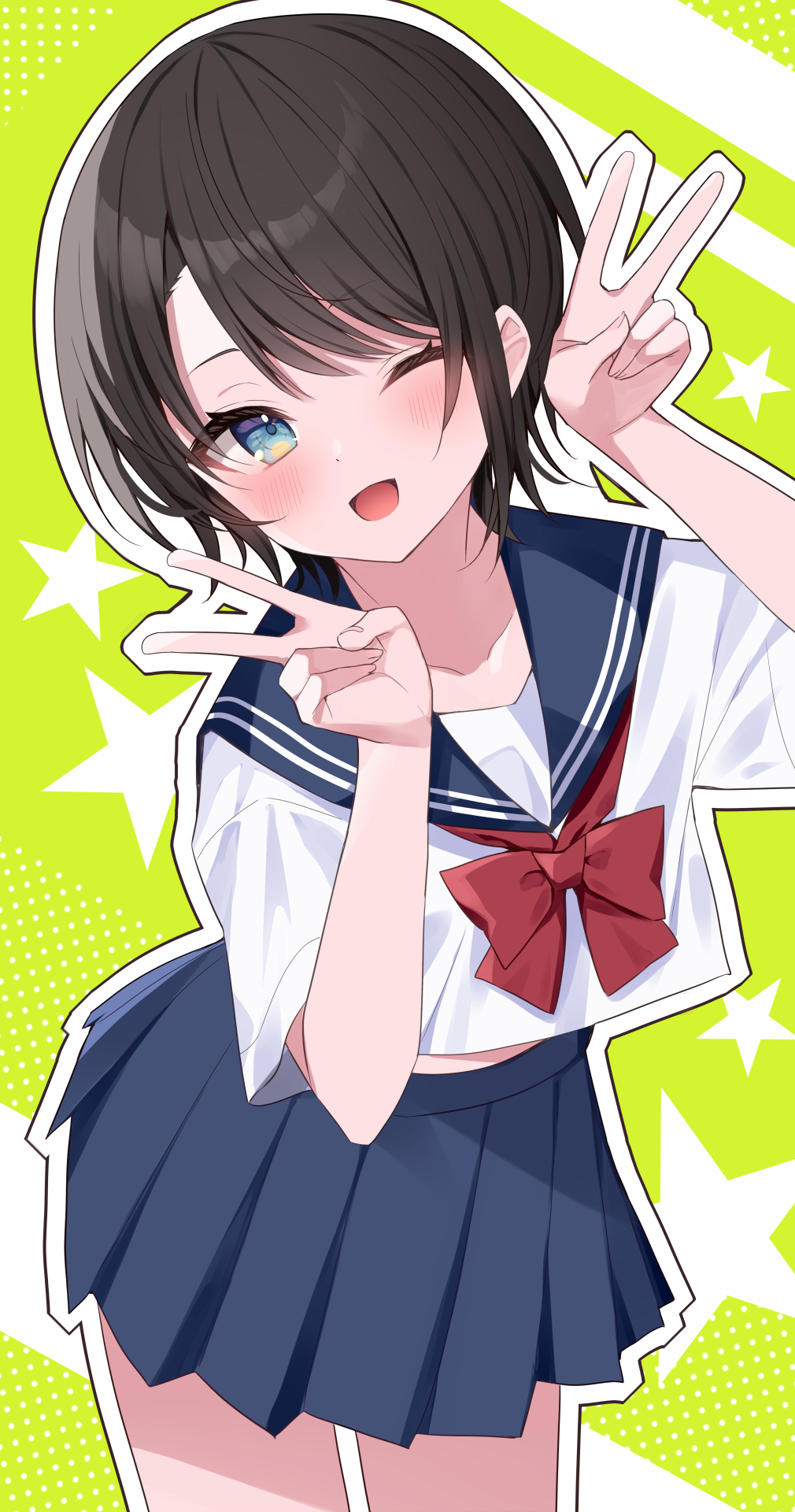 1girl alternate_costume blue_eyes blue_sailor_collar blue_skirt blush brown_hair double_v highres hololive looking_at_viewer maruru_(marurupan) neckerchief one_eye_closed oozora_subaru open_mouth red_neckerchief sailor_collar school_uniform shirt short_hair skirt smile solo star_(symbol) v virtual_youtuber white_shirt yellow_background