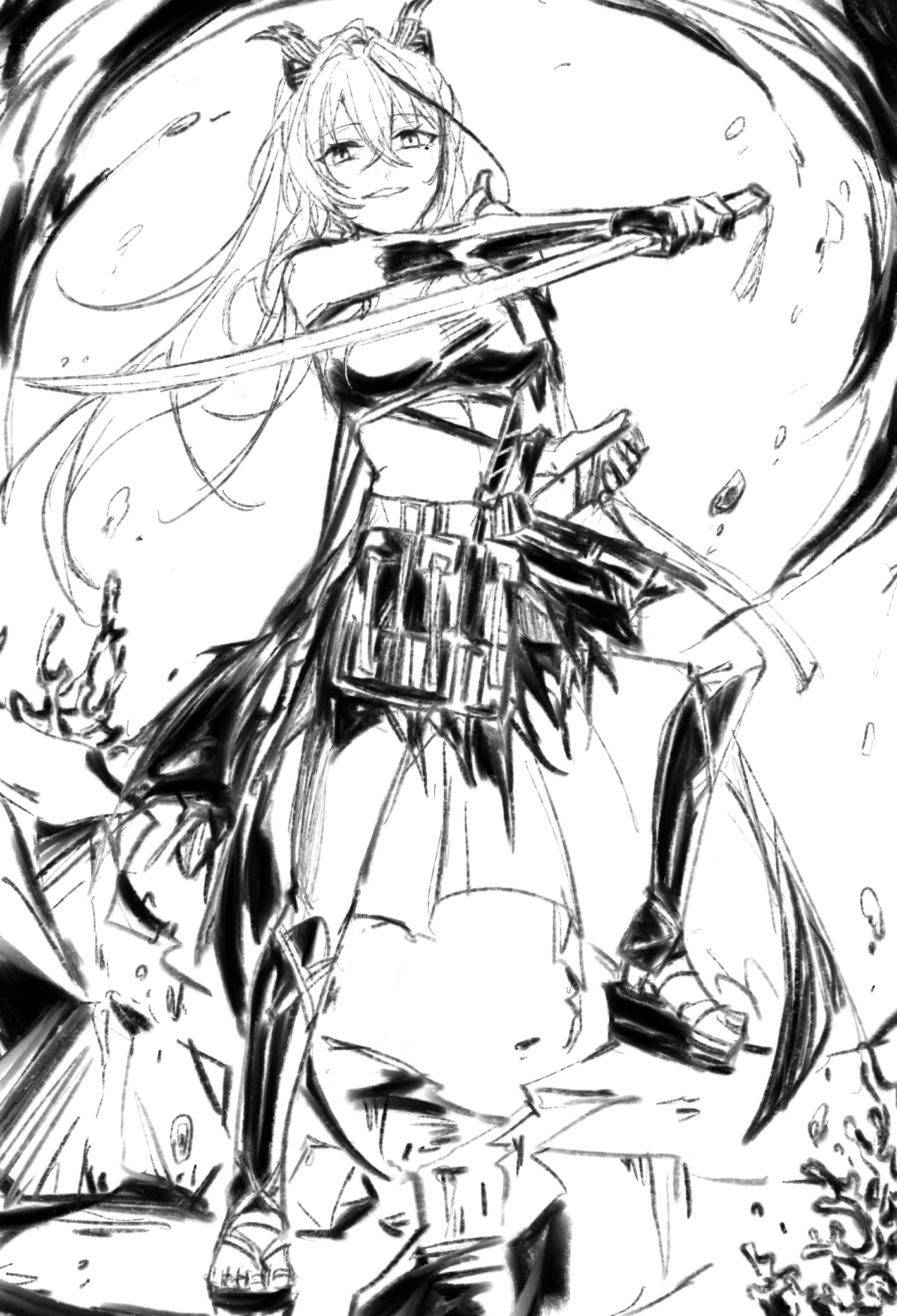 1girl akafuyu_(arknights) arknights black_shirt burning chinese_commentary crop_top fire flaming_sword flaming_weapon full_body grin hair_between_eyes highres holding holding_sword holding_weapon katana long_hair looking_at_viewer midriff_peek pantyhose rock scabbard schwarzcrz sheath shirt smile solo standing sword teeth translation_request weapon white_background