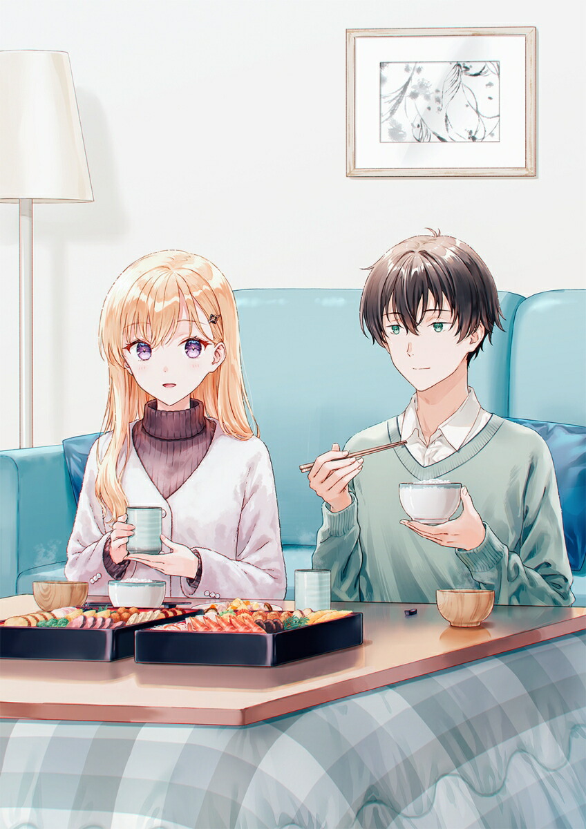 1boy 1girl asamura_yuuta ayase_saki blonde_hair bowl brother_and_sister brother_and_step-sister brown_cardigan brown_hair brown_sweater cardigan chopsticks closed_mouth collared_shirt couch textless_cover_page cup eating food gimai_seikatsu green_cardigan green_eyes hair_ornament hairclip highres hiten_(hitenkei) holding holding_bowl holding_chopsticks holding_cup kotatsu lamp living_room long_hair long_sleeves looking_at_another official_art parted_lips picture_frame purple_eyes rice second-party_source shadow shirt short_hair siblings sitting step-brother_and_step-sister step-siblings sushi sweater table under_kotatsu under_table white_shirt wooden_bowl