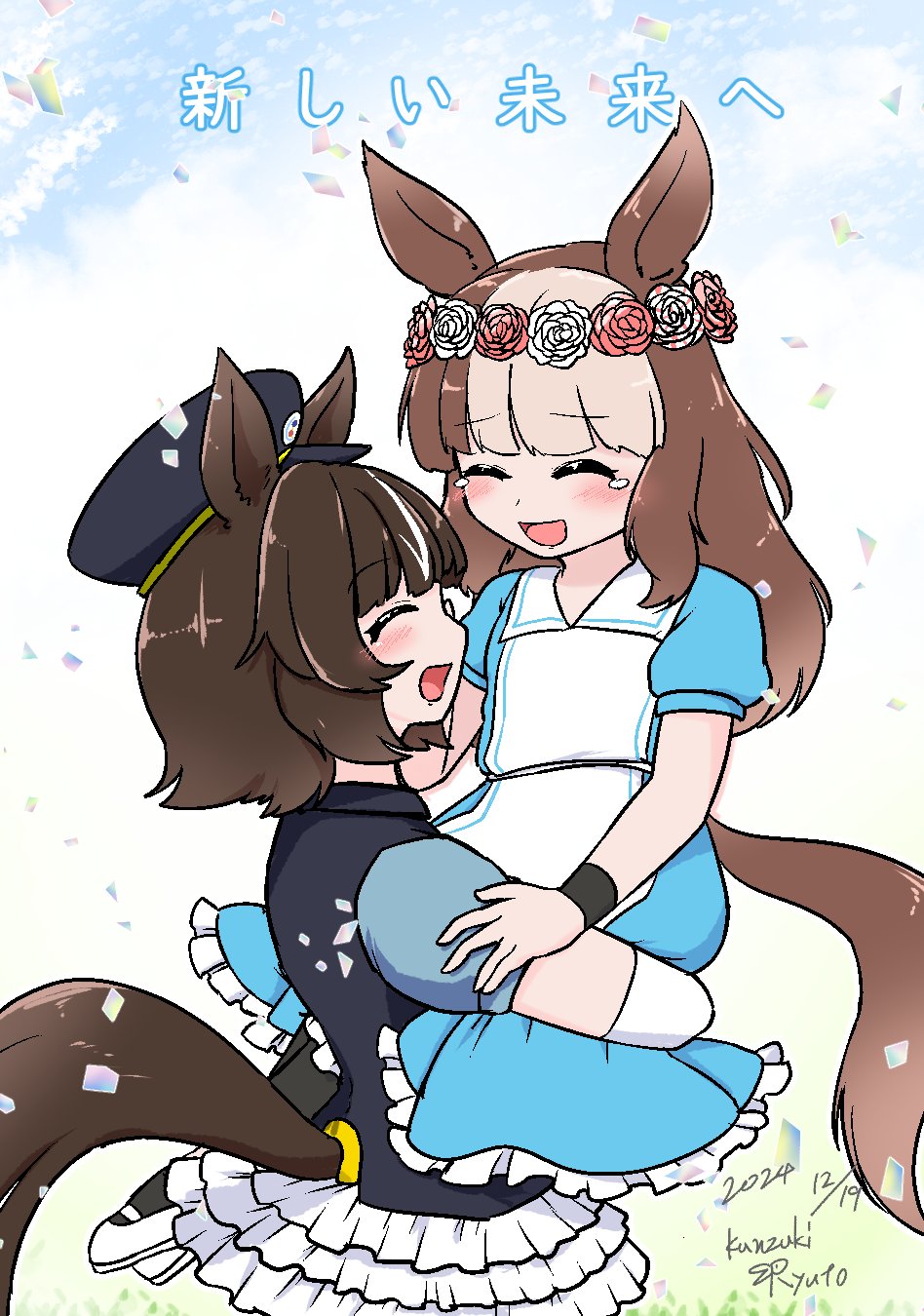 artist_name breasts brown_hair carrying carrying_person closed_eyes cloud dated frills grass hat head_wreath highres kanzaki_ryuuto long_hair medium_hair melody_lane_(racehorse) open_mouth original personification simple_background small_breasts tears titleholder_(racehorse) umamusume_tanuki