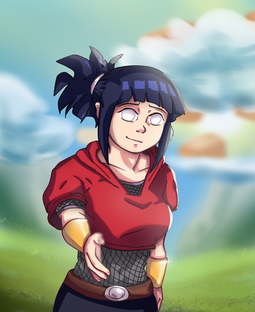 1girl belt blue_hair cowboy_shot crop_top crossover dragon_ball dragon_ball_super dragonball_z fishnet_sleeves fishnets fusion gold_bracer highres hyuuga_hinata kale_(dragon_ball) light_smile naruto_(series) nervous spiked_hair thedarkvictim