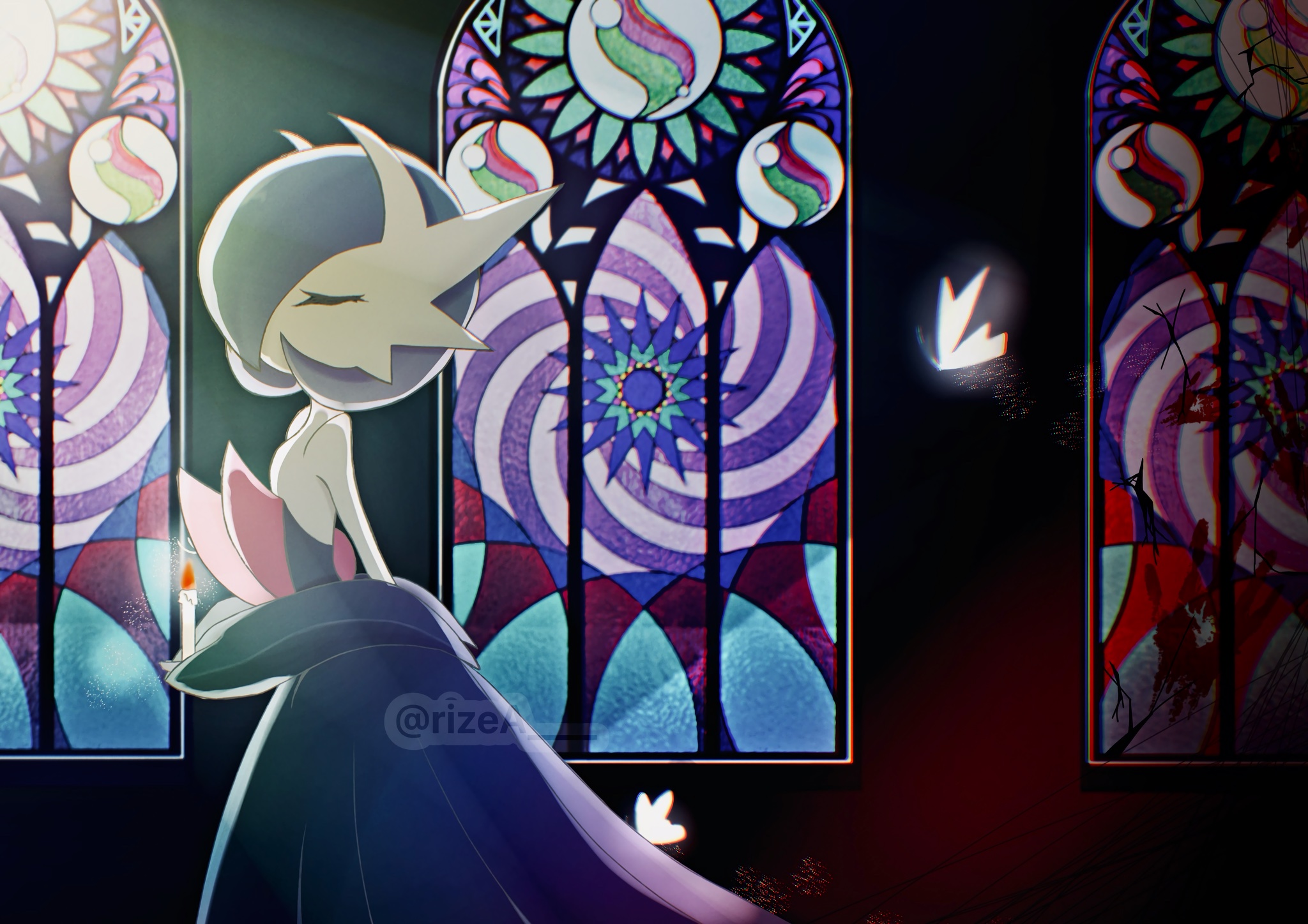 alternate_color artist_name black_dress black_gloves blue_hair bob_cut closed_eyes dress elbow_gloves from_side gardevoir gen_3_pokemon gloves highres mega_evolution_symbol mega_gardevoir mega_pokemon nintendo pokemon pokemon_(creature) rize_(r) shiny_pokemon stained_glass strapless strapless_dress watermark