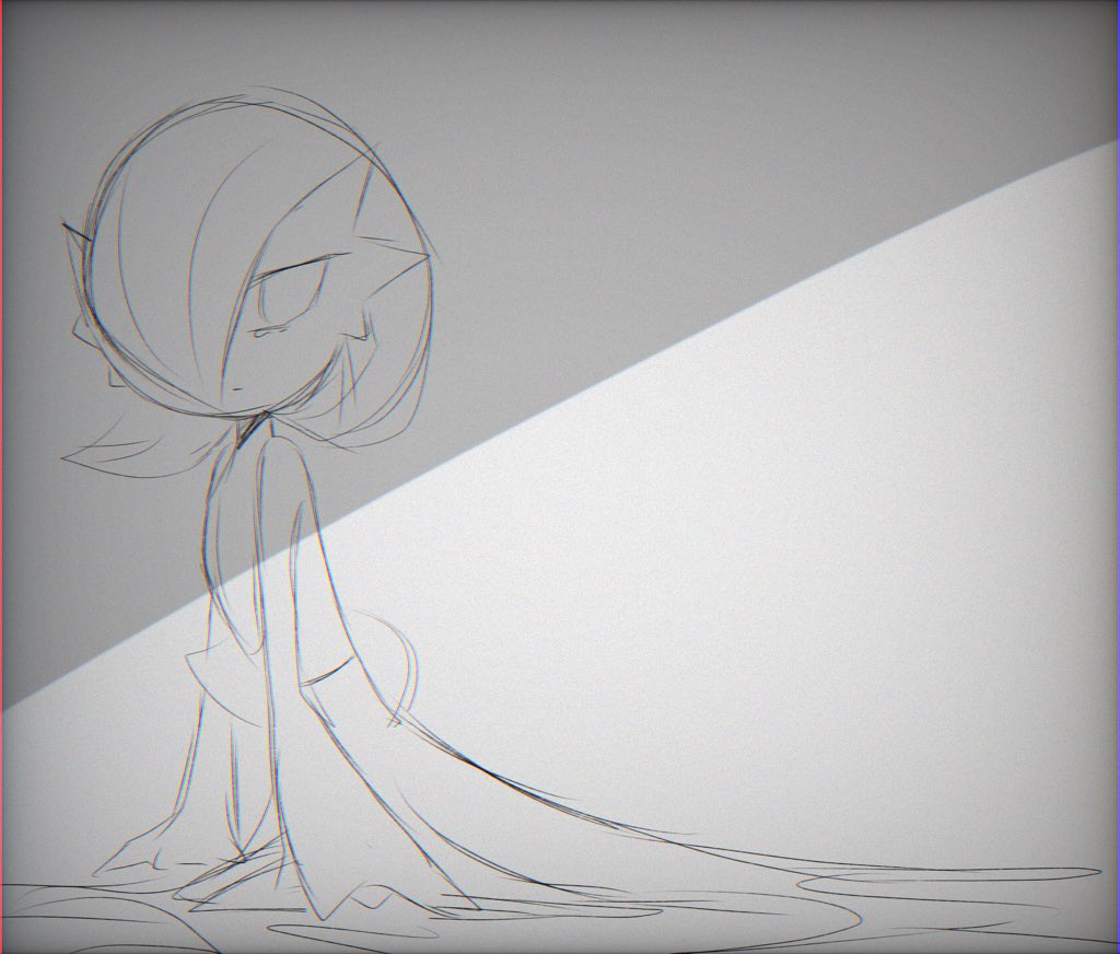 1girl bob_cut chromatic_aberration closed_mouth female_focus flat_chest from_side gardevoir gen_3_pokemon grey_background greyscale hair_over_one_eye kneeling leaning_forward looking_afar monochrome nintendo one_eye_covered pokemon pokemon_(creature) rize_(r) sad short_hair simple_background sitting sketch solo tears