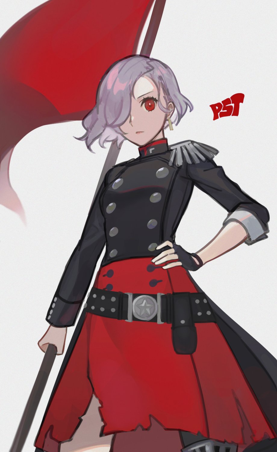 1girl belt black_belt black_gloves black_jacket closed_mouth earrings epaulettes erina_(p5t) erina_(persona_5_tactica) fingerless_gloves flag gloves grey_background grey_hair hair_over_one_eye hand_on_own_hip highres holding holding_flag jacket jewelry looking_at_viewer mudo_on8 persona persona_5 persona_5_tactica red_eyes red_flag red_skirt short_hair simple_background single_epaulette single_fingerless_glove single_glove skirt solo torn_clothes torn_skirt