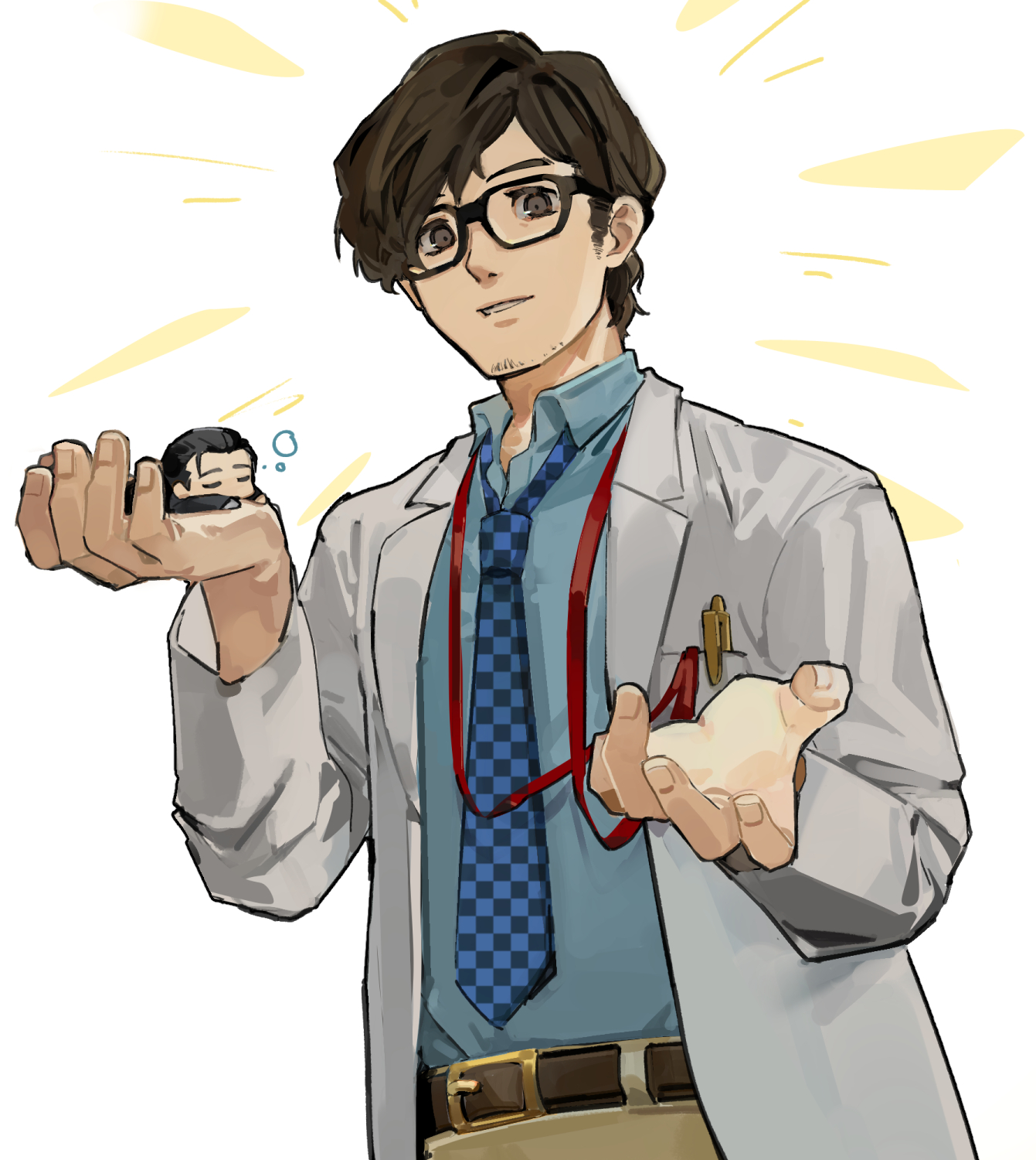 2boys a_osora511 beard_stubble belt black-framed_eyewear black_hair blue_necktie blue_shirt brown_belt brown_eyes brown_hair brown_pants carrying carrying_person checkered_necktie chibi closed_eyes coat facial_hair glasses hands_up highres kasukabe_toshiro lanyard looking_at_viewer male_focus maruki_takuto multiple_boys necktie object_in_pocket open_clothes open_coat pants parted_lips pen_in_pocket persona persona_5 persona_5_tactica persona_5_the_royal pocket shirt short_hair size_difference sleeping stubble teeth white_coat