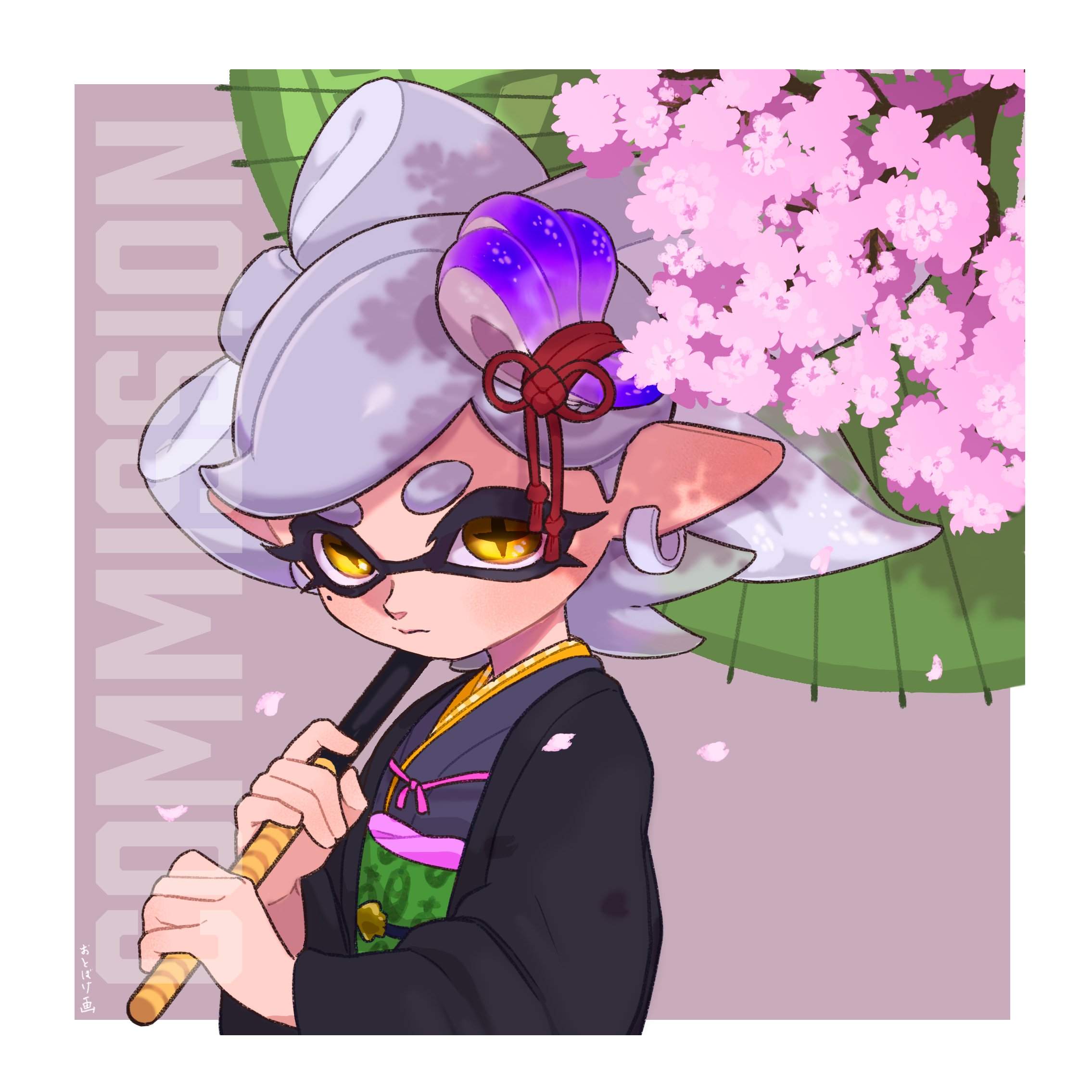 1girl black_haori border bow-shaped_hair cherry_blossoms closed_mouth colored_tips commentary commission cross-shaped_pupils earrings english_commentary food-themed_hair_ornament green_hair grey_hair grey_kimono hair_ornament haori highres holding holding_umbrella inkling japanese_clothes jewelry kimono long_sleeves marie_(kimono)_(splatoon) marie_(splatoon) medium_hair mixed-language_commentary mole mole_under_eye multicolored_hair nintendo obi obiage obijime oil-paper_umbrella otoboke-san pink_background pointy_ears sash simple_background solo splatoon_(series) splatoon_2 swept_bangs symbol-shaped_pupils tentacle_hair thick_eyebrows two-tone_hair umbrella watermark white_border wide_sleeves yellow_eyes