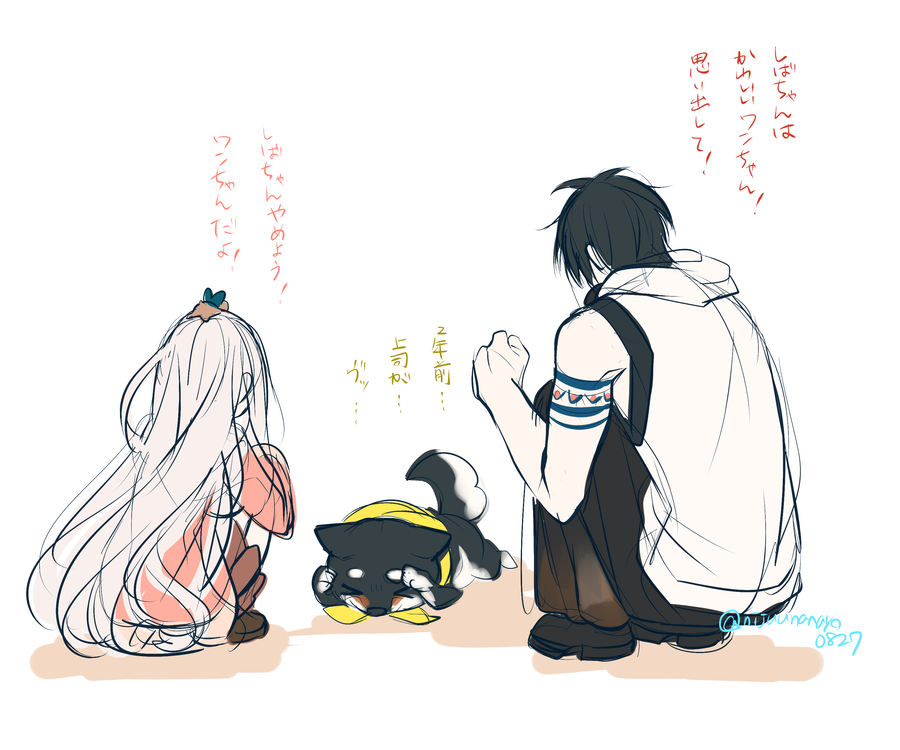 >_< 1boy 1girl absurdres animal animal_on_head bare_arms bare_shoulders black_footwear black_hair black_pants brown_footwear brown_skirt clenched_hand closed_eyes colored_shadow dog facing_away gonzalez_(machita_chima) grey_hair hamster highres hood hood_down hooded_jacket jacket kokumucho_(nijisanji) kuroi_shiba long_hair machita_chima machita_chima_(1st_costume) nijisanji ninahachi on_head pants pink_jacket pleated_skirt shadow shoes simple_background sketch skirt sleeveless sleeveless_jacket squatting translation_request twitter_username very_long_hair virtual_youtuber white_background white_jacket yumeoi_kakeru yumeoi_kakeru_(1st_costume)