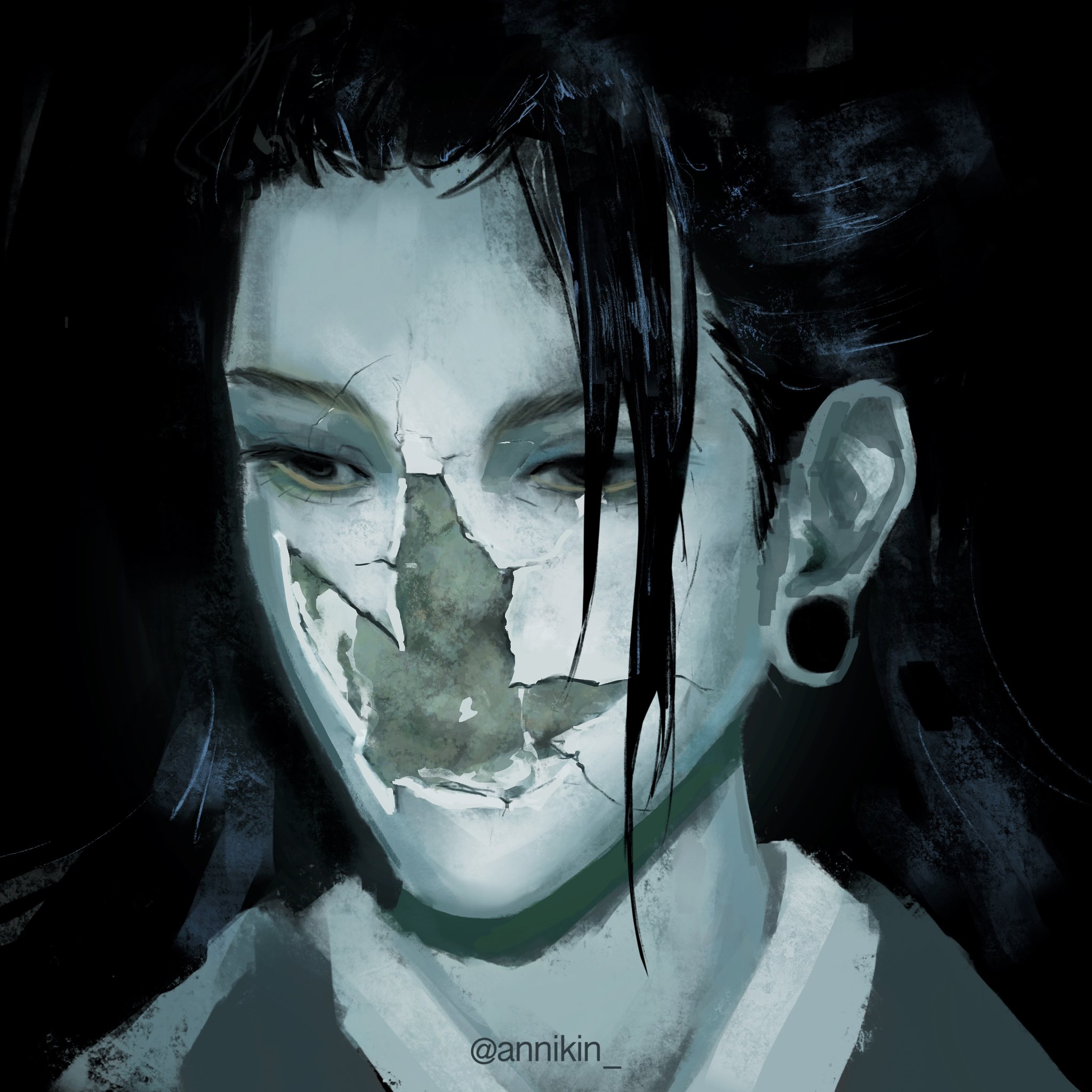 1boy album_cover_redraw annikin black_eyes black_hair commentary crack cracked_skin derivative_work ear_piercing earrings english_commentary eyelashes geto_suguru highres jewelry jujutsu_kaisen long_hair looking_down madra_(album) male_focus piercing plug_(piercing) portrait solo twitter_username very_long_hair