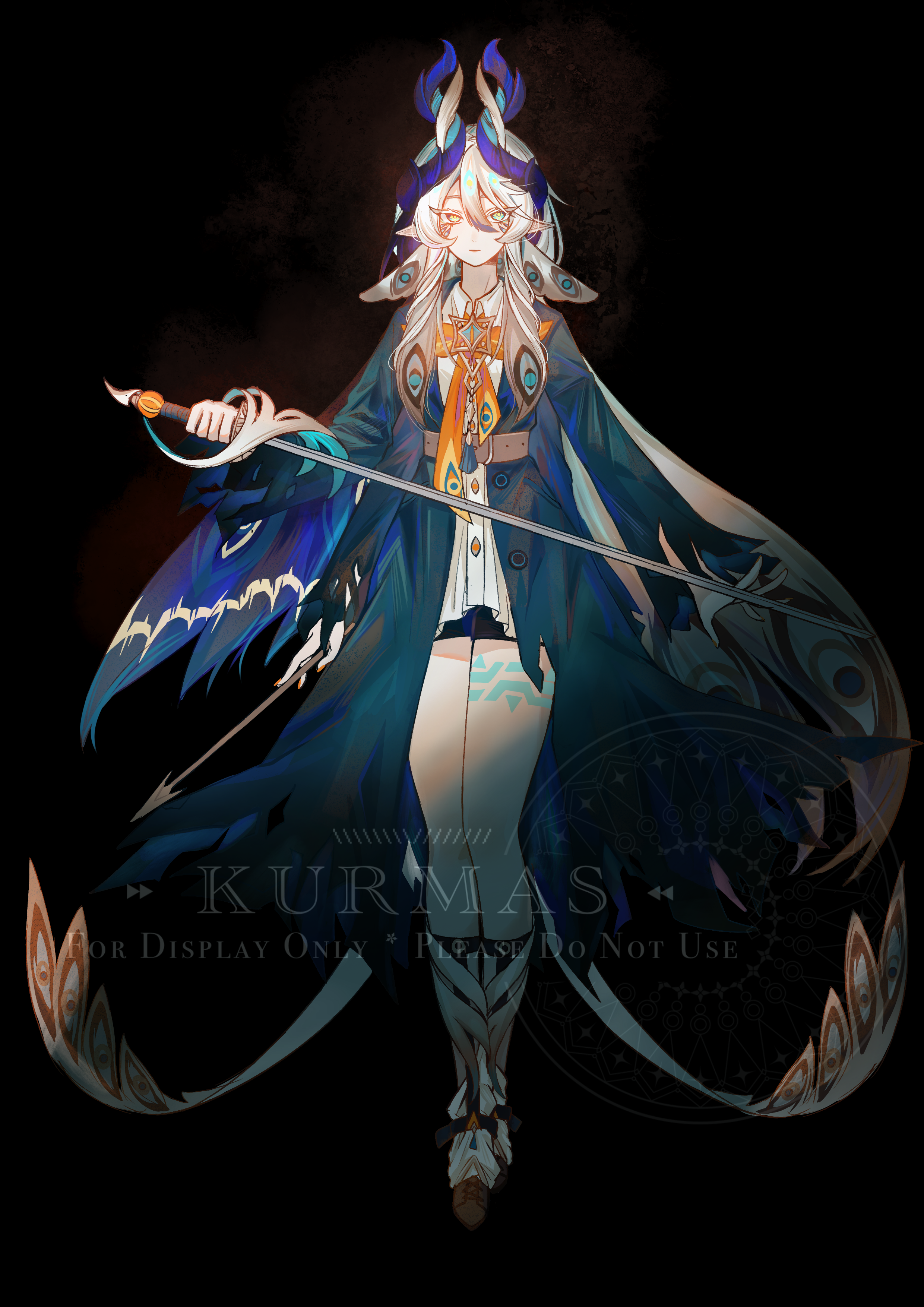 absurdres belt high-waist_belt black_background blonde_hair blue_coat blue_eyes boots brown_belt chinese_commentary closed_mouth coat collared_shirt commission dress dress_shirt earrings frilled_dress frills genshin_impact hand_up headpiece highres holding holding_weapon horns jewelry leg_tattoo long_hair long_sleeves looking_at_viewer multicolored_eyes muyingzi976 open_clothes open_coat original pointy_ears shirt simple_background standing sword tattoo thick_thighs thighs weapon wide_sleeves