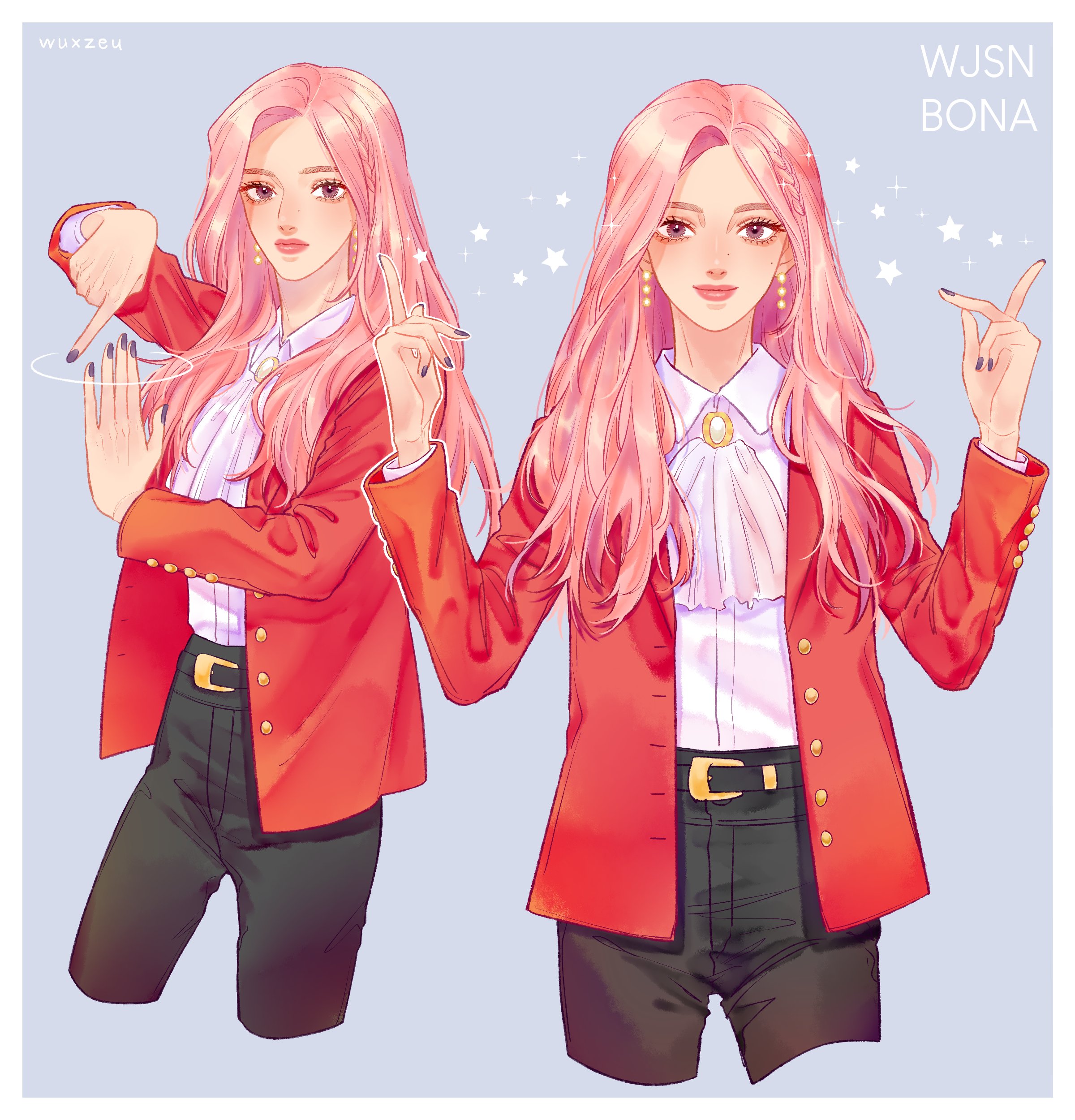 1girl absurdres artist_name_(singer) ascot belt black_nails black_pants bona_(wjsn) commentary cowboy_shot cropped_legs earrings group_name highres jacket jewelry k-pop long_hair looking_at_viewer multiple_views pants pink_hair pink_lips purple_background real_life red_jacket shirt smile white_shirt wing_collar wjsn wuxzeu