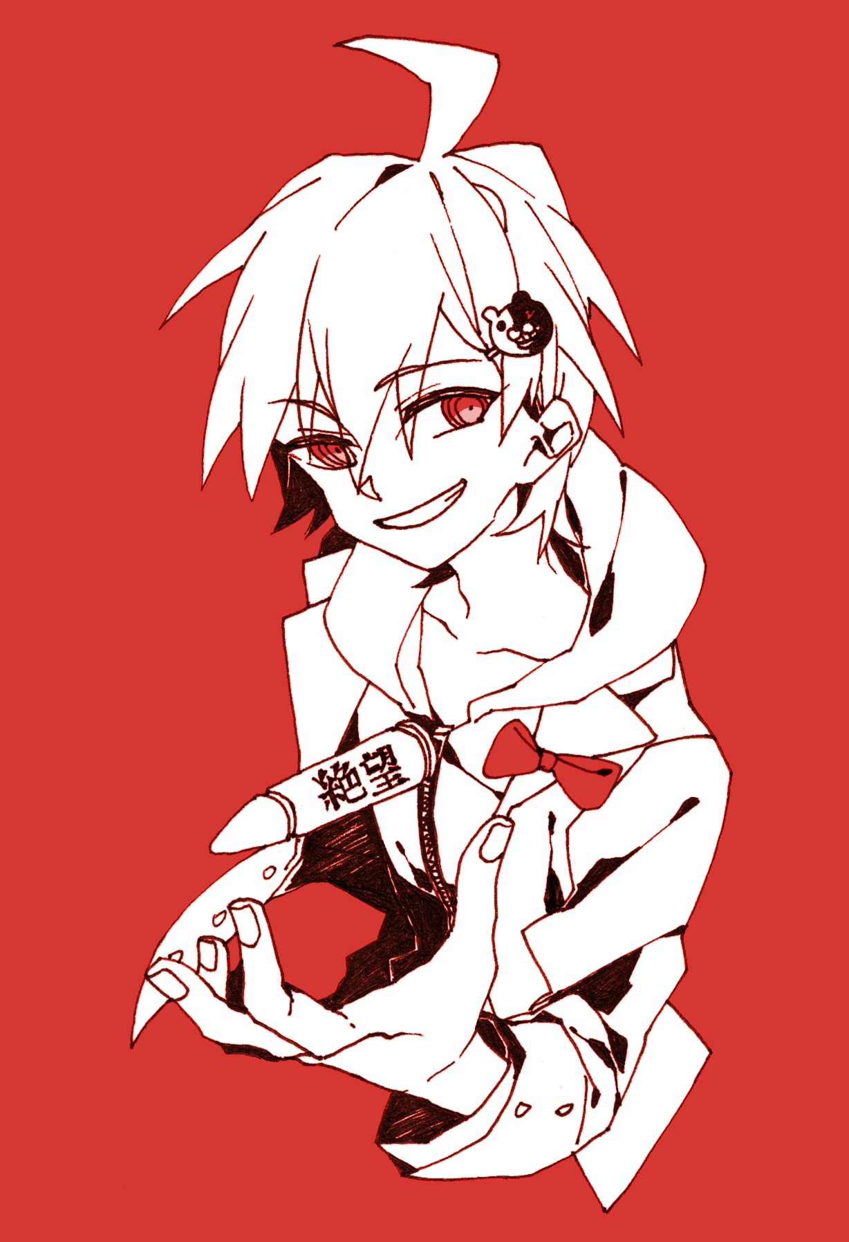 1boy ahoge alternate_universe bear_hair_ornament blazer bow bowtie bullet buttons collarbone collared_jacket crazy cropped_torso danganronpa:_trigger_happy_havoc danganronpa_(series) dark_persona eyes_visible_through_hair fingernails greyscale_with_colored_background grin hair_between_eyes hair_ornament highres hood hood_down hooded_jacket jacket lapels layered_sleeves long_sleeves looking_at_viewer male_focus monokuma naegi_makoto nennen_(nene19515) notched_lapels object_floating_above_hand open_clothes open_jacket red_background red_bow red_bowtie red_eyes short_hair simple_background smile solo spot_color zipper zipper_pull_tab