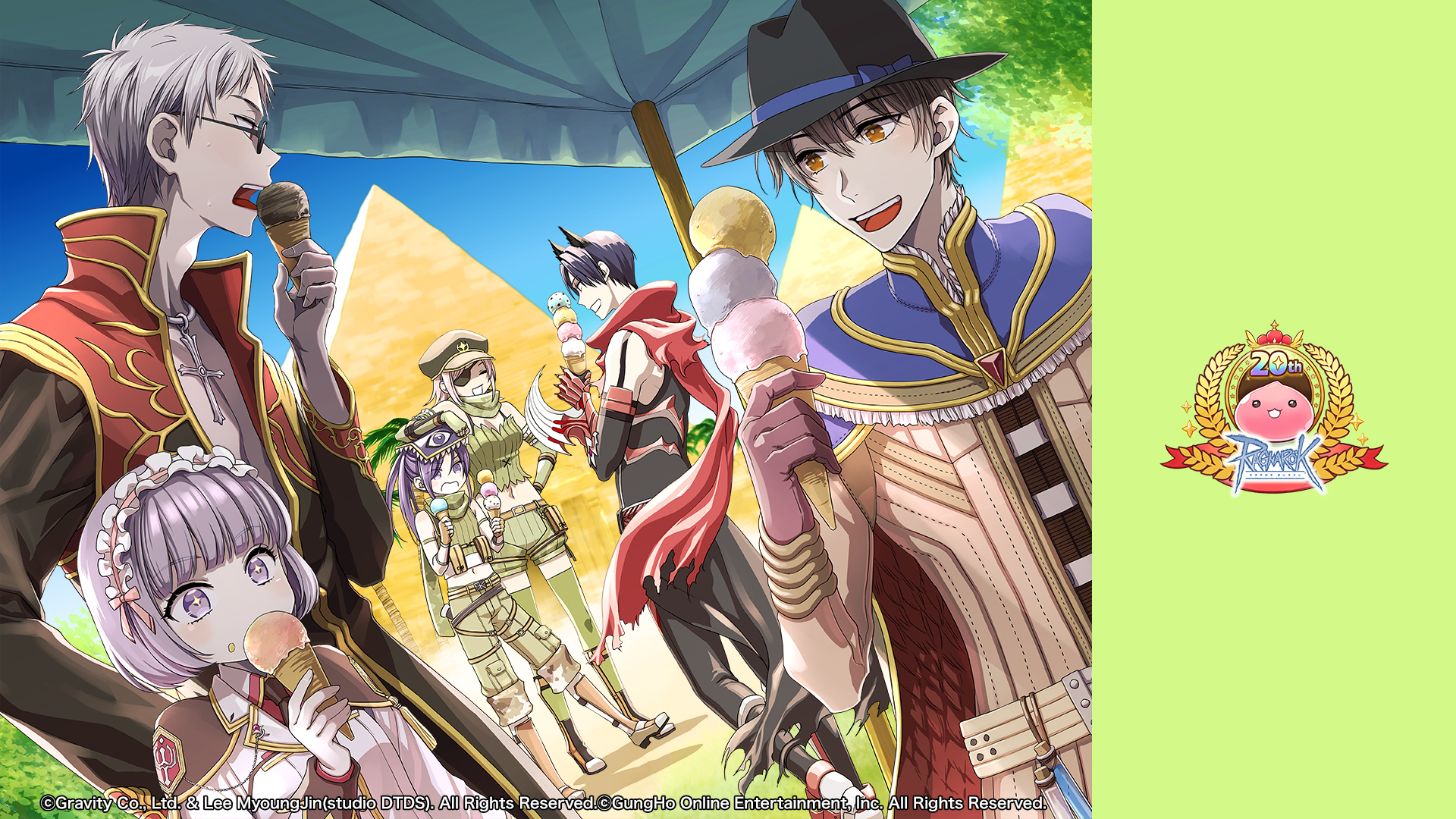 2girls 4boys alchemist_(ragnarok_online) arm_on_another's_head belt belt_pouch black-framed_eyewear black_coat black_gloves black_hat black_horns black_necktie black_pants black_shirt blazer blue_cape blue_sky boots bra_strap breasts brown_belt brown_coat brown_eyes brown_footwear brown_gloves brown_hair brown_hat camouflage_scarf canopy_(shelter) cape clear_sky closed_mouth coat collared_shirt copyright_notice cowboy_shot crop_top cross cross_necklace dutch_angle eating elbow_gloves eyepatch fedora fingerless_gloves food full_body gauntlets genetic_(ragnarok_online) glasses gloves gold_trim green_gloves green_scarf green_shirt green_shorts green_thighhighs green_tube_top grey_hair guillotine_cross_(ragnarok_online) hair_between_eyes hat highres holding holding_ice_cream_cone horns ice_cream ice_cream_cone jacket jewelry kotori_(pink_elephant) logo long_hair long_sleeves medium_breasts multicolored_coat multiple_boys multiple_girls necklace necktie official_alternate_costume official_art official_wallpaper open_mouth outdoors palm_tree pants peaked_cap pouch priest_(ragnarok_online) purple_eyes purple_hair pyramid_(structure) ragnarok_online ranger_(ragnarok_online) red_cape red_coat red_scarf red_shirt rideword_(ragnarok_online) scarf shirt short_hair shorts sky sleeveless sleeveless_shirt small_breasts smile strapless tall_female thighhighs torn_clothes torn_scarf tree tube_top two-sided_cape two-sided_fabric two-tone_coat white_jacket