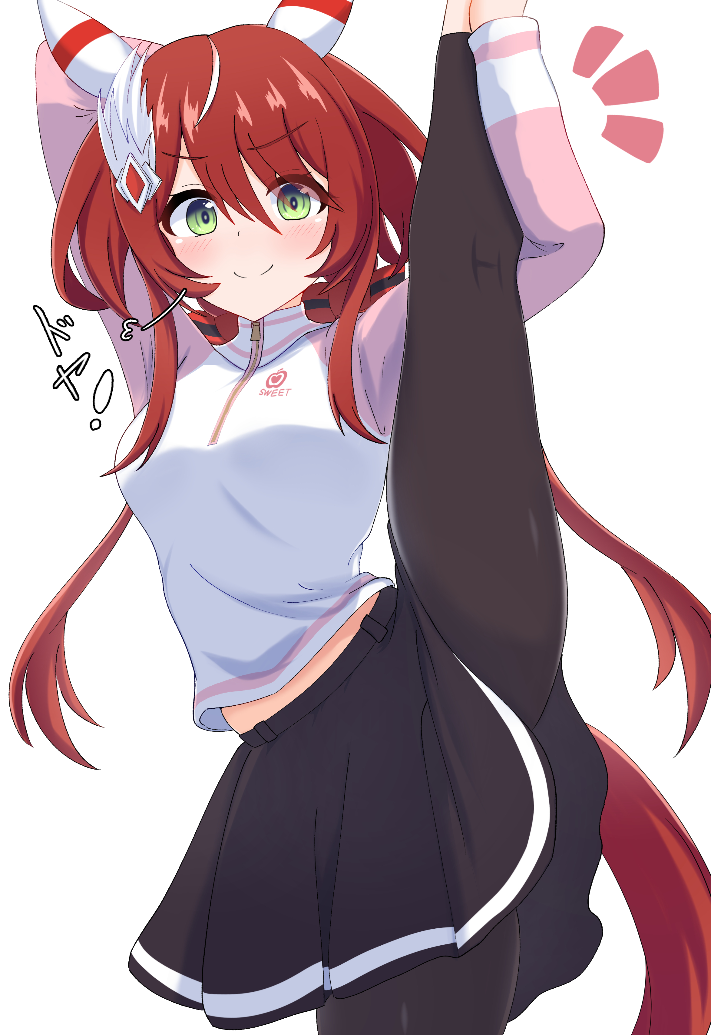 1girl absurdres animal_ears arms_up breasts casual commentary_request green_eyes hair_between_eyes hair_ornament highres horse_ears horse_girl leg_up long_hair looking_at_viewer low_twintails okomesuihanki pantyhose ribbon simple_background small_breasts smile smug stretching twintails umamusume white_background win_variation_(umamusume)