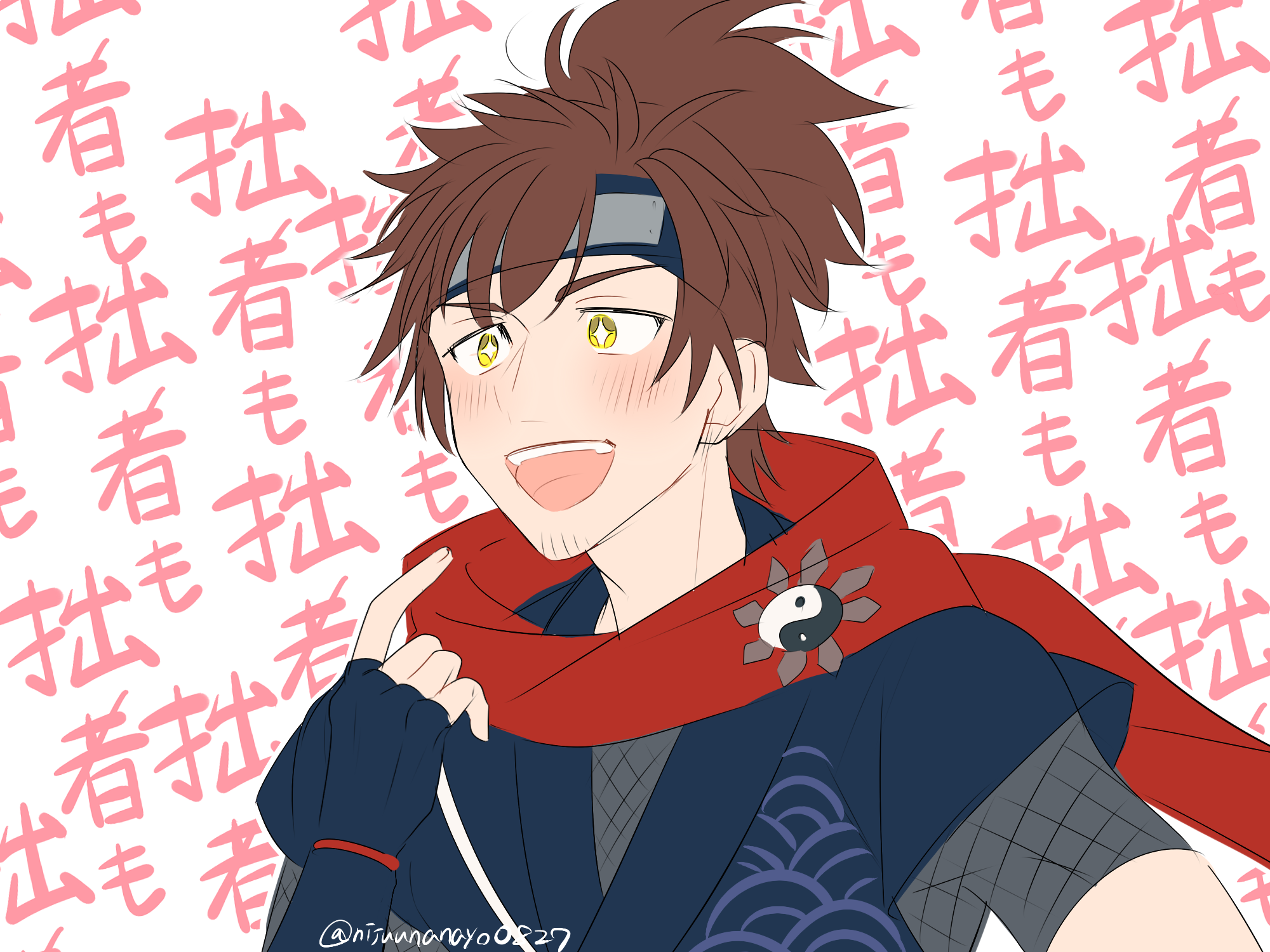 +_+ 1boy belmond_banderas blue_gloves blue_kimono blush brown_hair character_request check_character facial_hair fingerless_gloves fishnet_top fishnets forehead_protector gloves hand_up highres japanese_clothes kimono layered_sleeves male_focus nijisanji ninahachi ninja pointing pointing_at_self ponytail short_sleeves simple_background solo stubble text_background thick_eyebrows translation_request twitter_username upper_body virtual_youtuber white_background yellow_eyes yin_yang