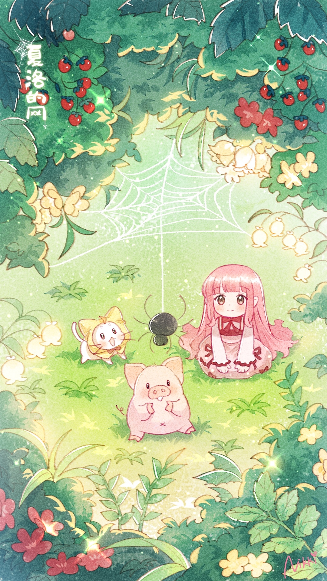 1girl animal argyle_clothes argyle_dress artist_request blunt_bangs bow bowtie brown_eyes bug capelet cat charlotte's_web charlotte_(charlotte's_web) chibi chinese_commentary chinese_text closed_mouth clothed_animal commentary_request copyright_name crossover dot_nose dress dress_ribbon ear_covers eyelashes flower food frilled_sleeves frills fruit grass hair_spread_out highres hood hood_up hooded_capelet kneeling light_blush light_particles lily_of_the_valley long_hair long_sleeves looking_at_animal medium_dress momo_(nikki) nikki_(nikki) nikki_(series) official_art pig pinafore_dress pink_dress pink_hair red_bow red_bowtie red_flower red_ribbon ribbon second-party_source shadow shining_nikki shirt sidelocks silk sitting sleeveless sleeveless_dress sleeves_past_wrists smile spider spider_web spring_(season) straight_hair strawberry translation_request very_long_hair whiskers white_cat white_flower white_shirt wilbur_(charlotte's_web) yellow_capelet yellow_flower