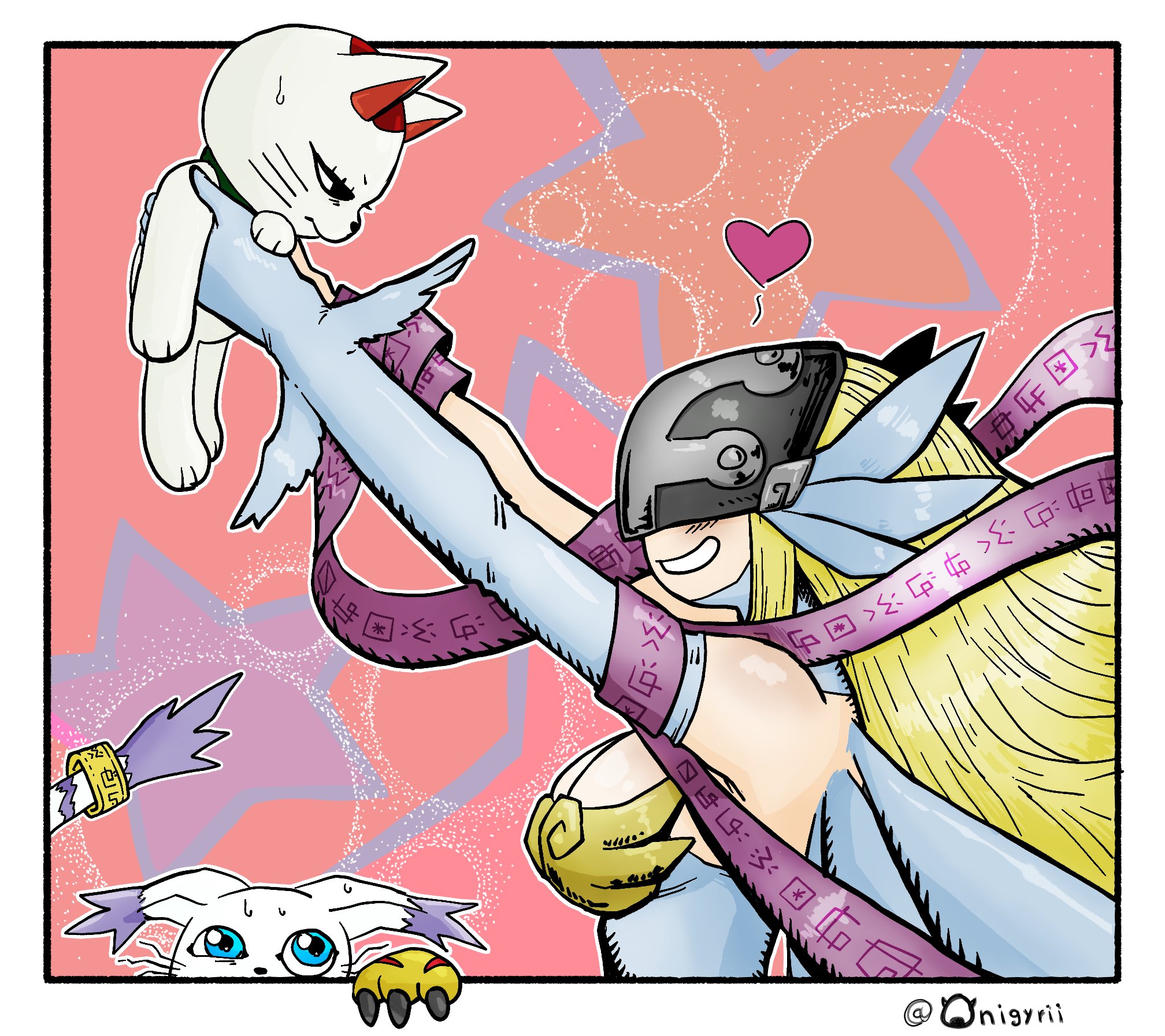 angel angel_girl angewomon animal_ears cat cat_ears crossover dandadan digimon digimon_(creature) gloves head_wings highres holy_ring long_hair mask tail tailmon turbo_granny_(dandadan) wings