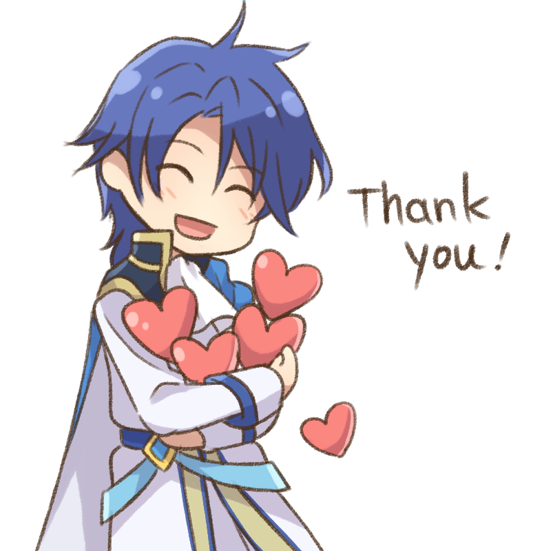 1boy :d ^_^ ascot belt blue_belt blue_cape blue_hair cape chibi chibi_only closed_eyes coat commentary_request cowboy_shot curtained_hair fire_emblem fire_emblem:_genealogy_of_the_holy_war heart high_collar holding light_blush male_focus melcabcd nintendo open_mouth pants parted_bangs partial_commentary short_hair sigurd_(fire_emblem) simple_background smile solo thank_you too_many too_many_hearts two-sided_cape two-sided_fabric white_ascot white_background white_cape white_coat white_pants