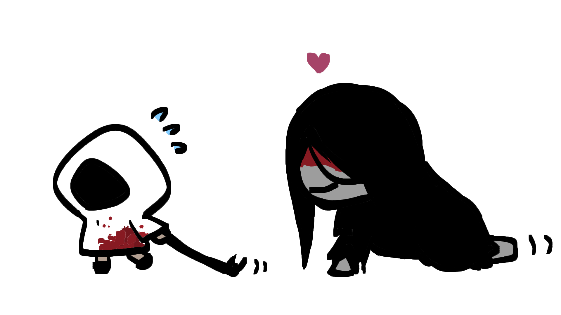 1boy 1girl adashino_adami all_fours black_hair black_kimono blood blood_on_clothes blood_on_face chibi commentary_request crowbar flying_sweatdrops following full_body heart highres holding holding_crowbar homicipher hood hood_up japanese_clothes kimono long_hair mr._crawling official_style platina_(pla_vtuber) raincoat simple_background translation_request white_background white_raincoat