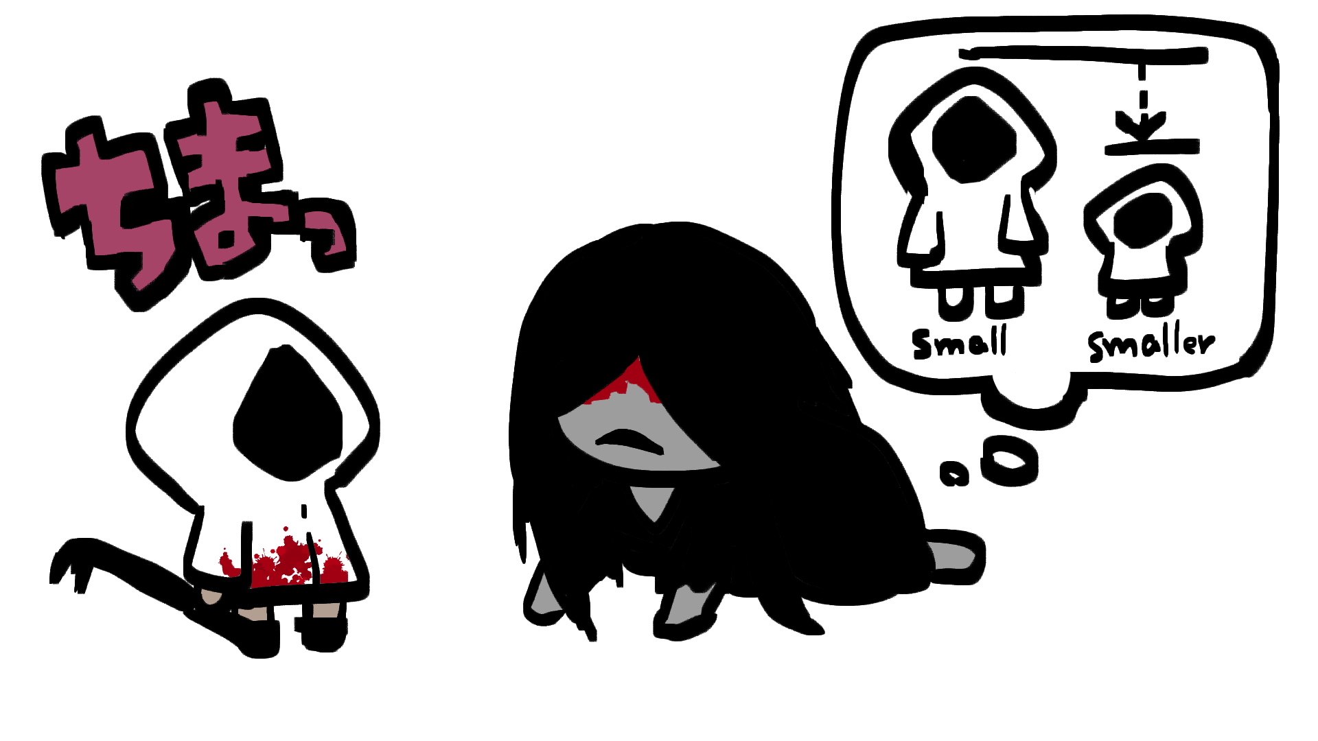 1boy 1girl adashino_adami all_fours black_hair black_kimono blood blood_on_clothes blood_on_face chibi commentary_request crowbar full_body highres holding holding_crowbar homicipher hood hood_up japanese_clothes kimono long_hair mr._crawling official_style platina_(pla_vtuber) raincoat simple_background speech_bubble thought_bubble translation_request white_background white_raincoat